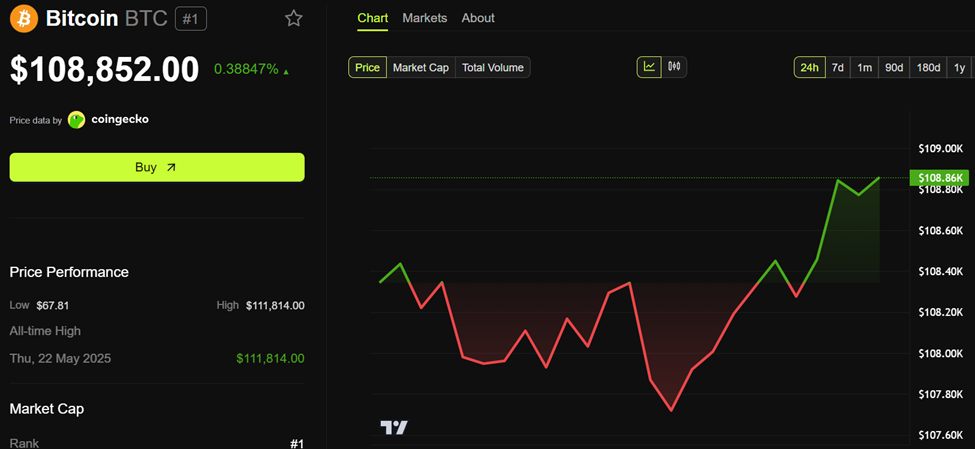 Bitcoin $108,000 से अधिक पर ट्रेड कर रहा है, संस्थागत भूख उच्च बनी हुई है, और BlackRock इस चार्ज का नेतृत्व कर रहा है।