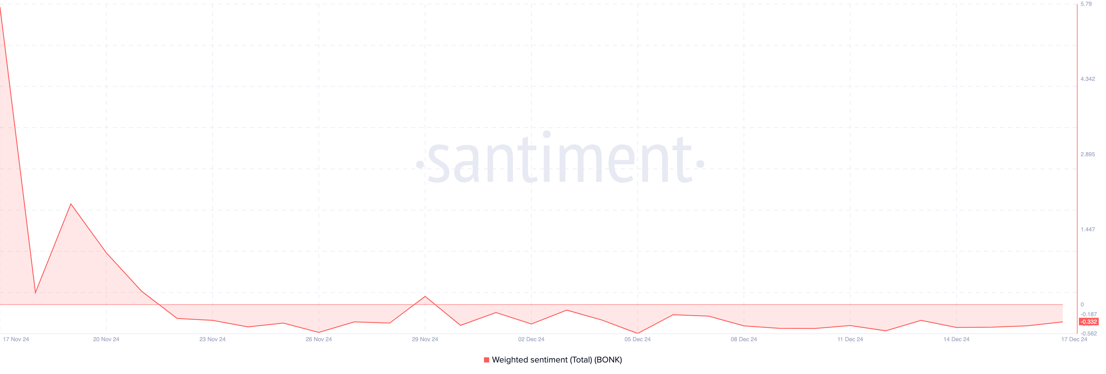 एक और मेट्रिक जो BONK के लिए आगे की गिरावट का संकेत देता है वह है वेटेड सेंटिमेंट, जो एक क्रिप्टोकरेंसी के बारे में ऑनलाइन चर्चाओं के स्वर के साथ सामाजिक मात्रा को जोड़ता है।