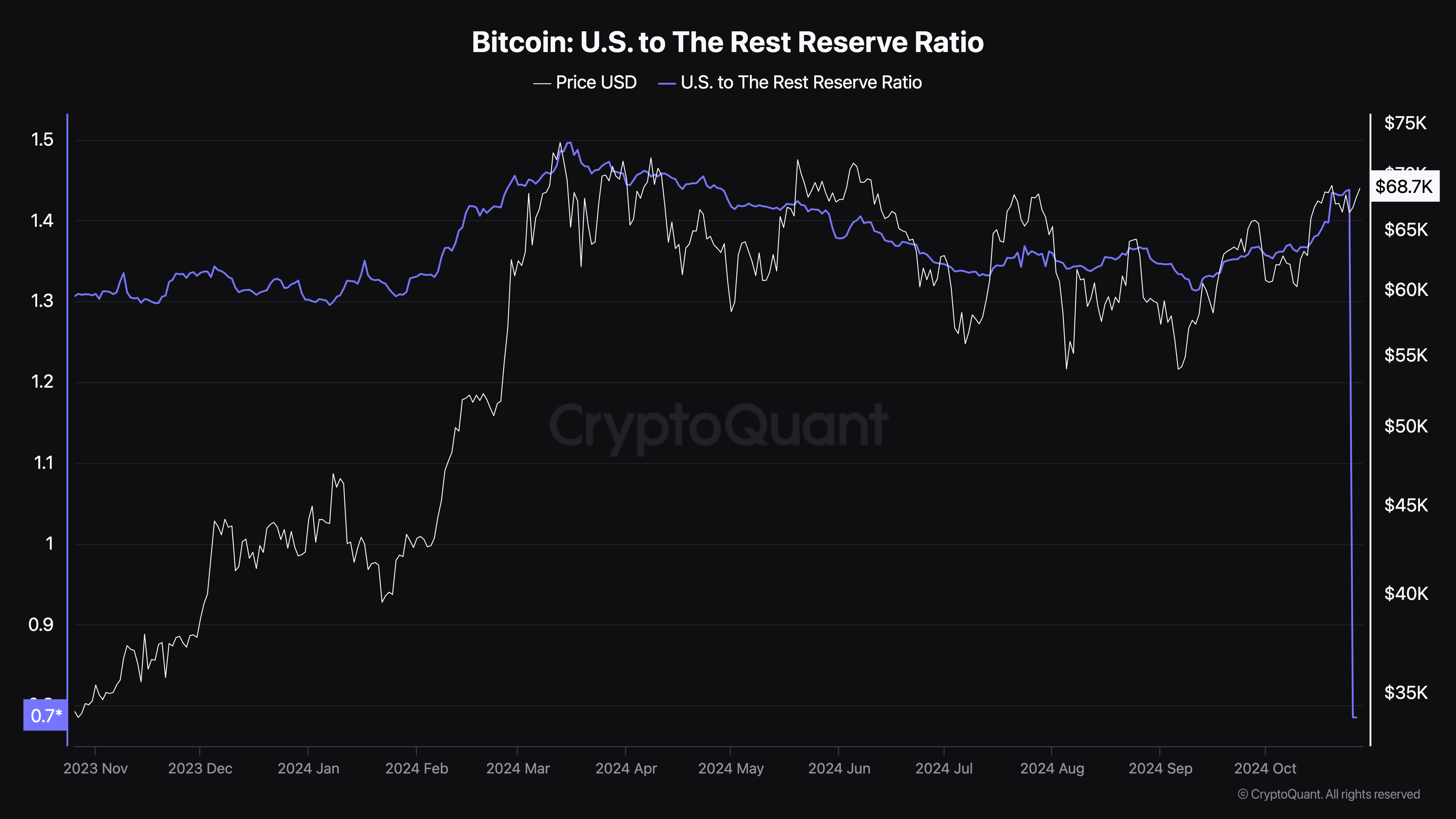 जब यह अनुपात बढ़ता है, तो यह संकेत देता है कि US-आधारित BTC होल्डिंग्स बढ़ रही हैं, जिससे US संस्थाओं से बढ़ती मांग का सुझाव मिलता है। इसके विपरीत, एक कमी इन संस्थाओं से कम एक्सपोज़र को दर्शाती है।
