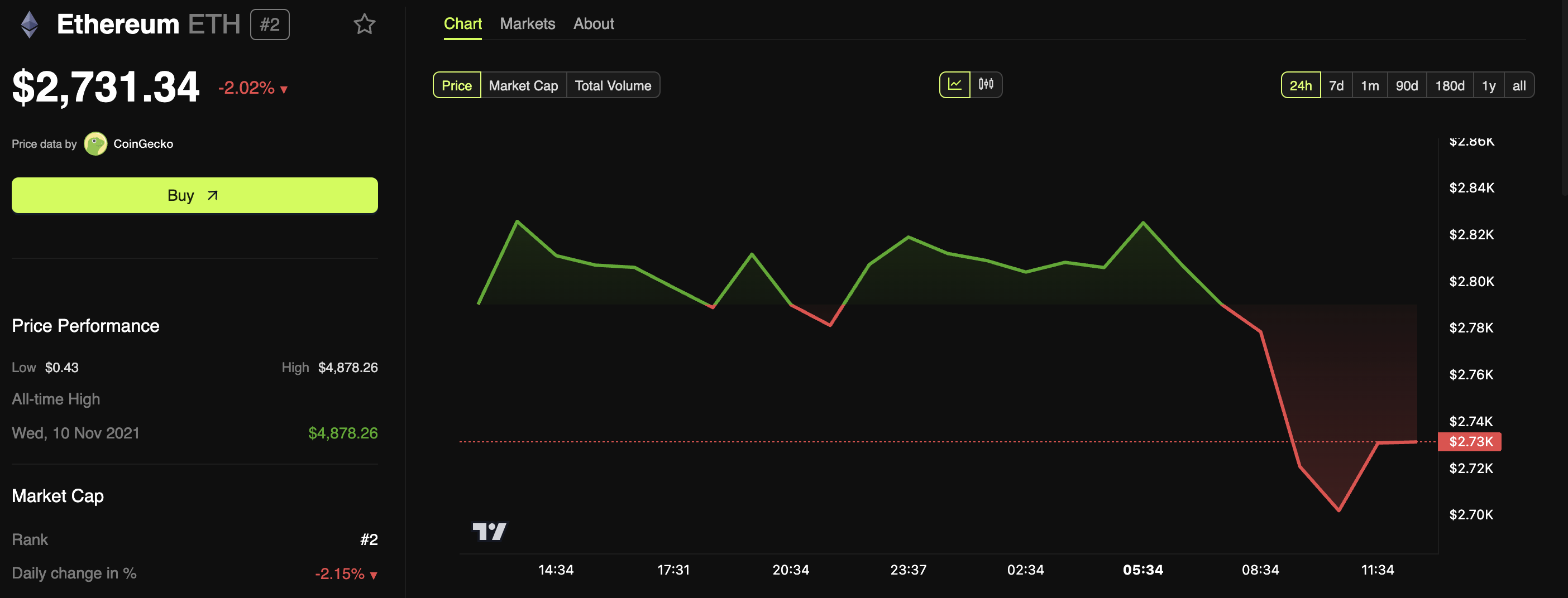 हालांकि एक संक्षिप्त रिकवरी के बाद, प्राइस फिर से गिर गई। लेखन के समय, ETH $2,731 पर ट्रेड कर रहा था, जो पिछले 24 घंटों में 2.0% की गिरावट का प्रतिनिधित्व करता है।