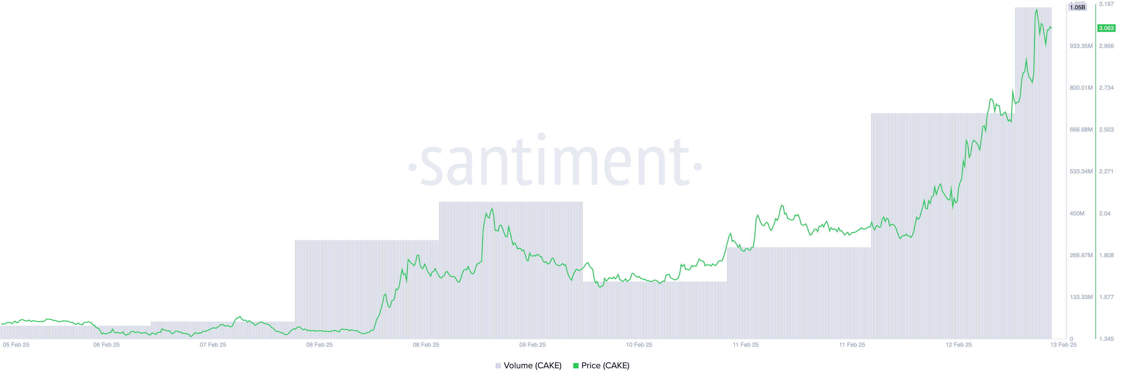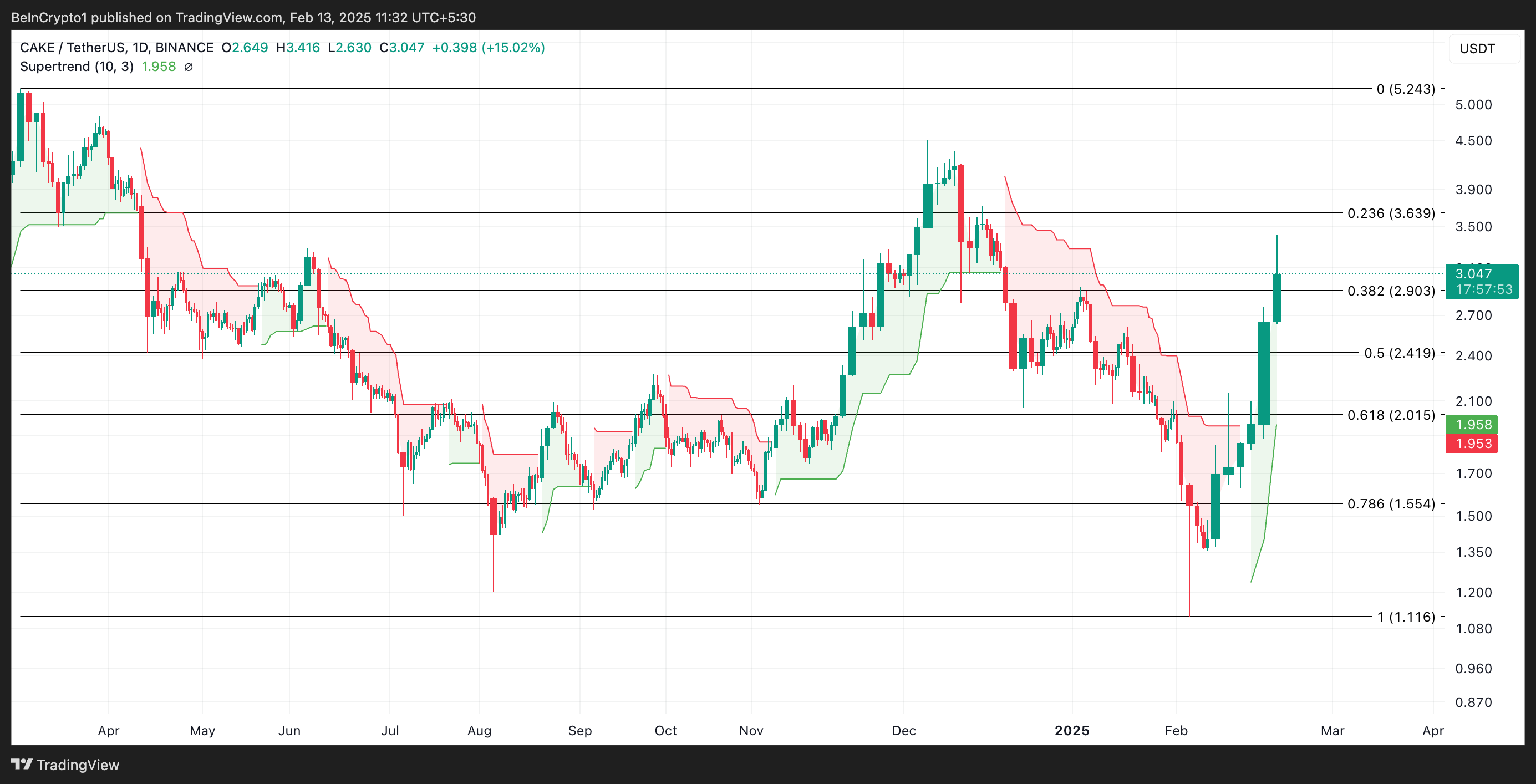 PancakeSwap पर ट्रेडिंग गतिविधि में इस उछाल ने इसके नेटिव टोकन, CAKE की मांग में महत्वपूर्ण वृद्धि को प्रेरित किया है, जिसकी कीमत पिछले 24 घंटों में 50% से अधिक बढ़ गई है। प्रेस समय पर, altcoin अपने वर्ष-से-तारीख के उच्चतम $3.04 पर ट्रेड कर रहा है।