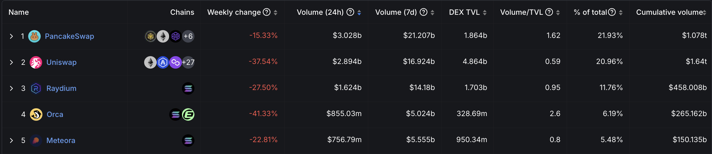 DeFiLlama के अनुसार, PancakeSwap पर ट्रेडिंग गतिविधि पिछले 24 घंटों में बढ़कर $3.02 बिलियन हो गई है। यह आंकड़ा अन्य DEXes से आगे है, जिसमें Uniswap उसी अवधि में $2.89 बिलियन पर पीछे है।