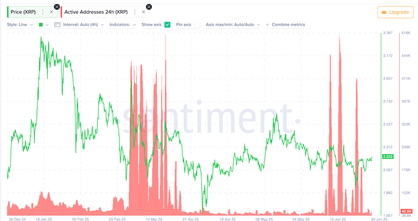 XRP के सक्रिय एड्रेस और वॉलेट्स, जो पिछले 24 घंटों में ट्रांजैक्शन कर रहे थे, जून में कई बार बढ़े, हर बार XRP की कीमत में वृद्धि से पहले। ये गतिविधि उछाल नए वॉलेट की भागीदारी का संकेत देते हैं, संभवतः नए खरीदारों या XRP व्हेल्स के रोटेशन से।