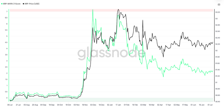 MVRV (Market Value to Realized Value) Z-Score, जो मार्केट कैप की तुलना realized cap से करता है, ब्रेकआउट के बाद भी अपेक्षाकृत शांत है। यह पहले 2025 की शुरुआत में XRP के $3 रन के दौरान लगभग 6.5 पर पहुंच गया था, लेकिन अब यह 2.0 के करीब है।