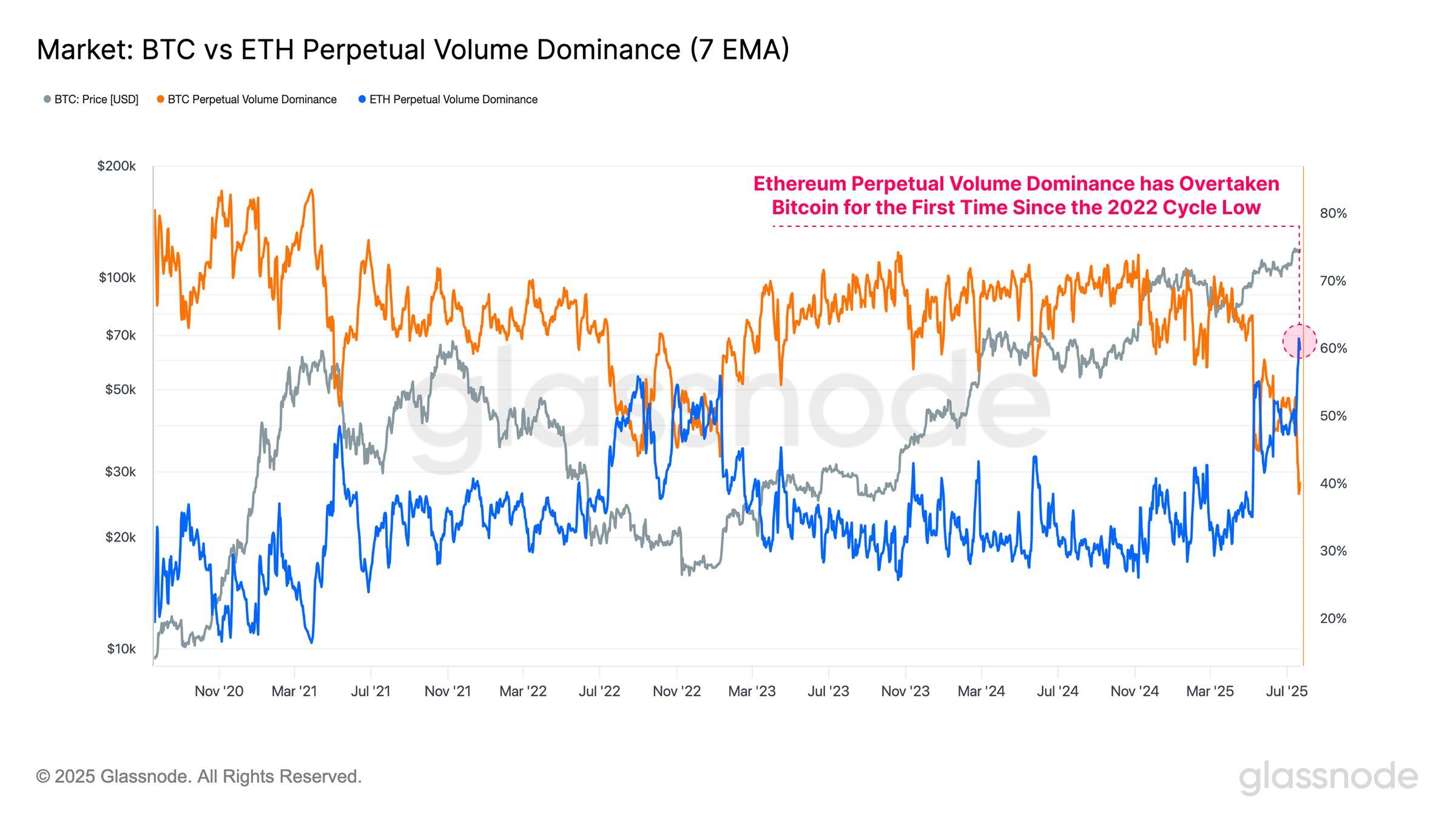 जुलाई के अंत तक ETH ने परपेचुअल वॉल्यूम का 60% से अधिक हिस्सा लिया। यह इंगित करता है कि ट्रेडर्स अब BTC की तुलना में ETH को अधिक सक्रियता से ट्रेड कर रहे हैं।