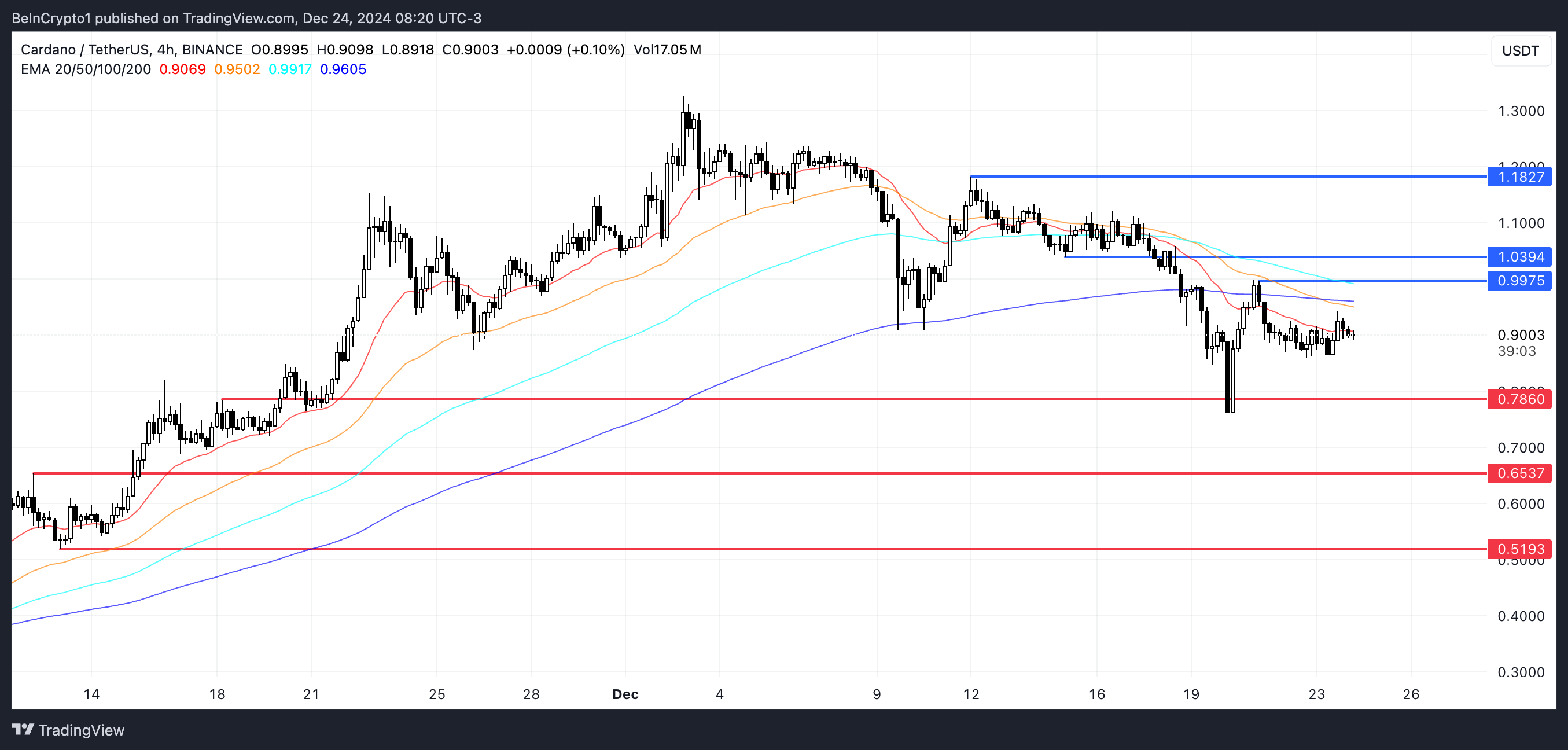 ADA EMA लाइनों ने 20 दिसंबर को एक डेथ क्रॉस बनाया, जिसमें शॉर्ट-टर्म EMA लॉन्ग-टर्म EMA के नीचे क्रॉस कर गया, जो एक क्लासिक मंदी का संकेत है जो निरंतर डाउनवर्ड मोमेंटम को दर्शाता है। अगर यह डाउनट्रेंड जारी रहता है, तो Cardano की कीमत और गिरावट का सामना कर सकती है, संभावित रूप से $0.78 के सपोर्ट लेवल का परीक्षण कर सकती है।
