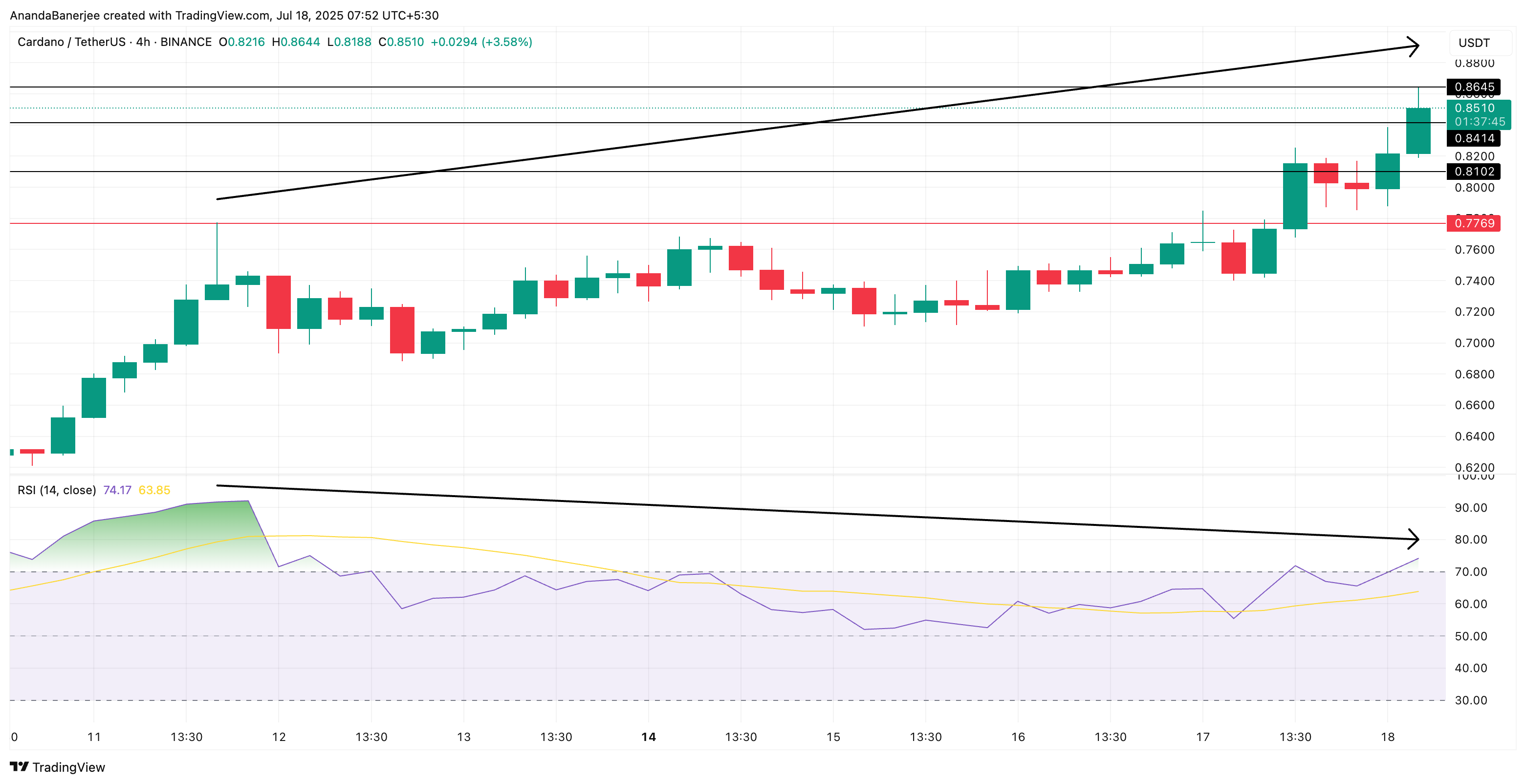 हालांकि, RSI (relative strength index) डाइवर्जेंस चीजों को थोड़ा धीमा कर सकता है। 4-घंटे के चार्ट पर, हालांकि, एक बियरिश डाइवर्जेंस उभर आया है। 11 जुलाई से, Cardano की कीमत उच्च स्तर पर जा रही है, लेकिन RSI निचले उच्च स्तर दिखा रहा है। यह असंगति यह सुझाव देती है कि खरीदार धीमे हो सकते हैं।