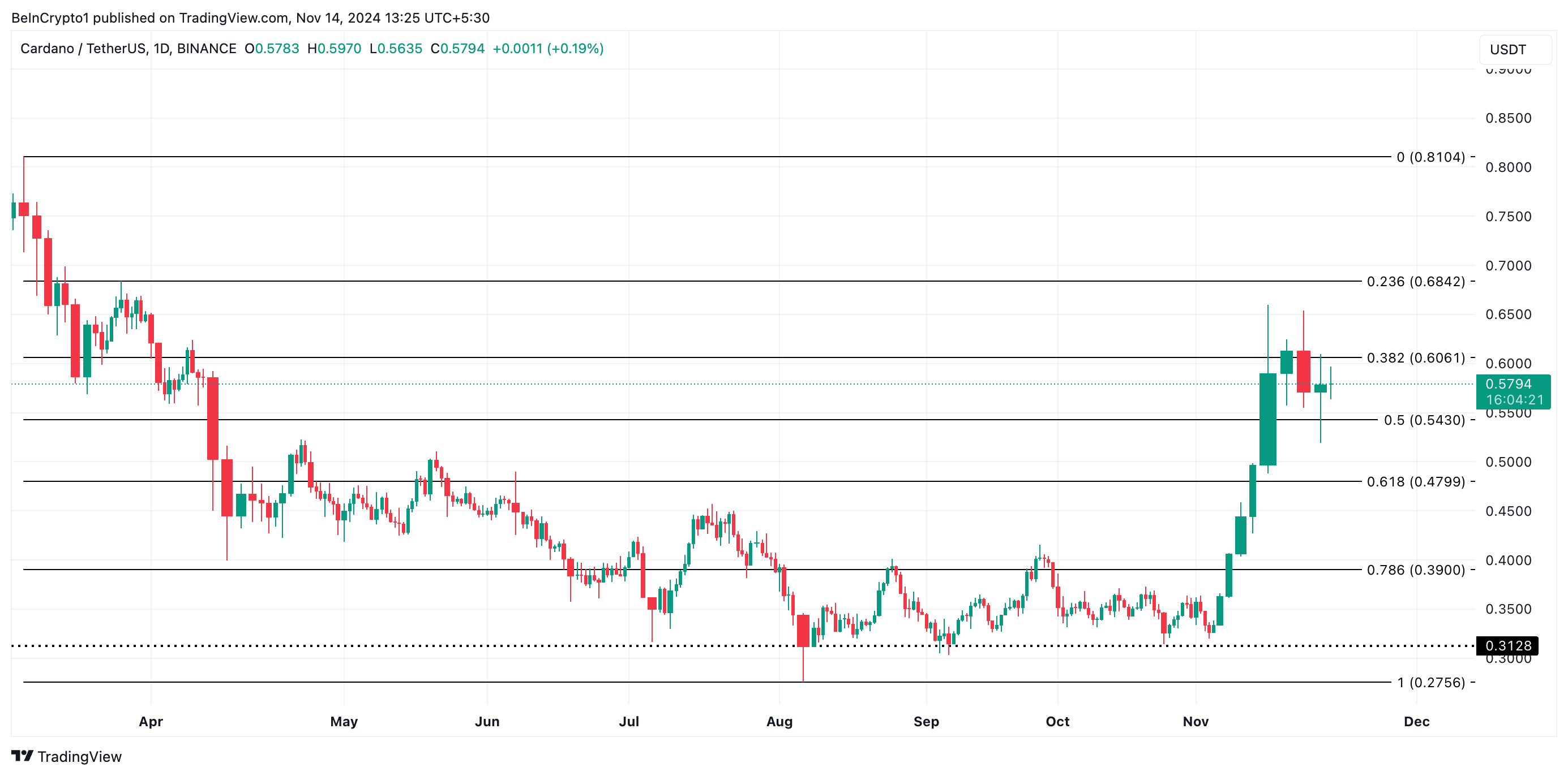 Cardano (ADA) पिछले कुछ हफ्तों से जीत की लहर पर है। पिछले सात दिनों में, इस ऑल्टकॉइन की कीमत में 55% की वृद्धि हुई है। यह वर्तमान में $0.57 पर कारोबार कर रहा है, जो अप्रैल के बाद से देखी गई आखिरी कीमत स्तर है।