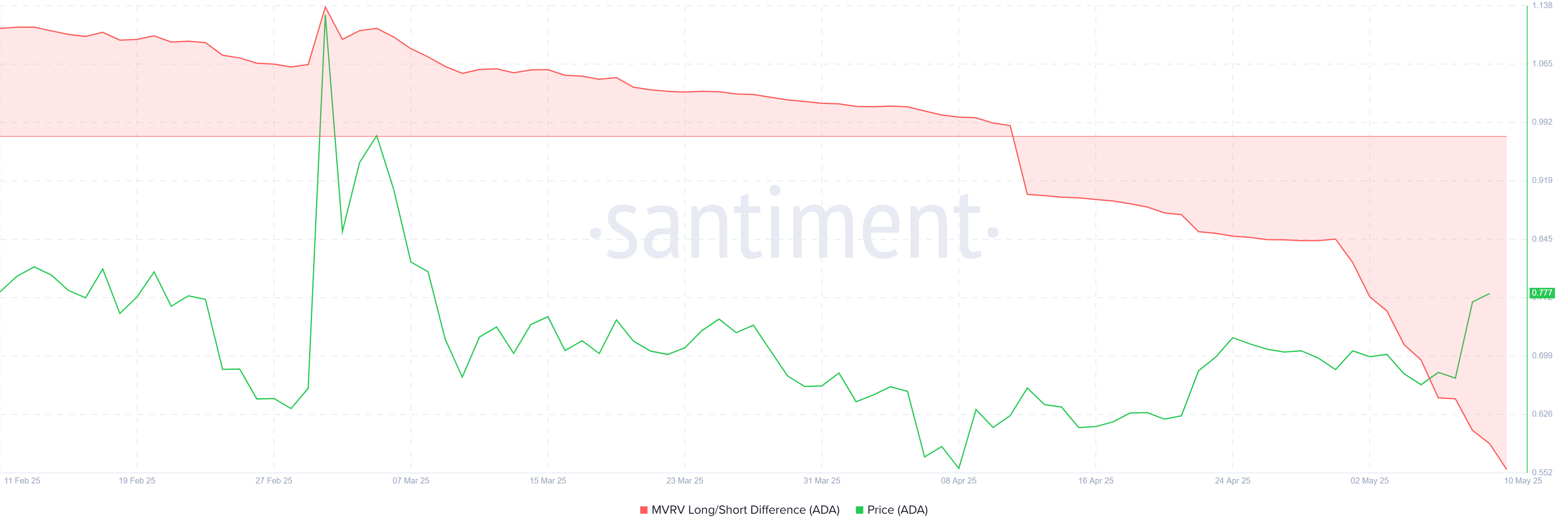 MVRV लॉन्ग/शॉर्ट डिफरेंस Cardano के लिए वर्तमान में -89% पर है। यह इंडिकेट करता है कि लॉन्ग-टर्म होल्डर्स (LTHs) लगभग शून्य लाभ का सामना कर रहे हैं, जबकि कुछ को नुकसान भी हो रहा है। दूसरी ओर, एक महीने से कम समय के शॉर्ट-टर्म होल्डर्स (STHs) को लाभ हो रहा है।