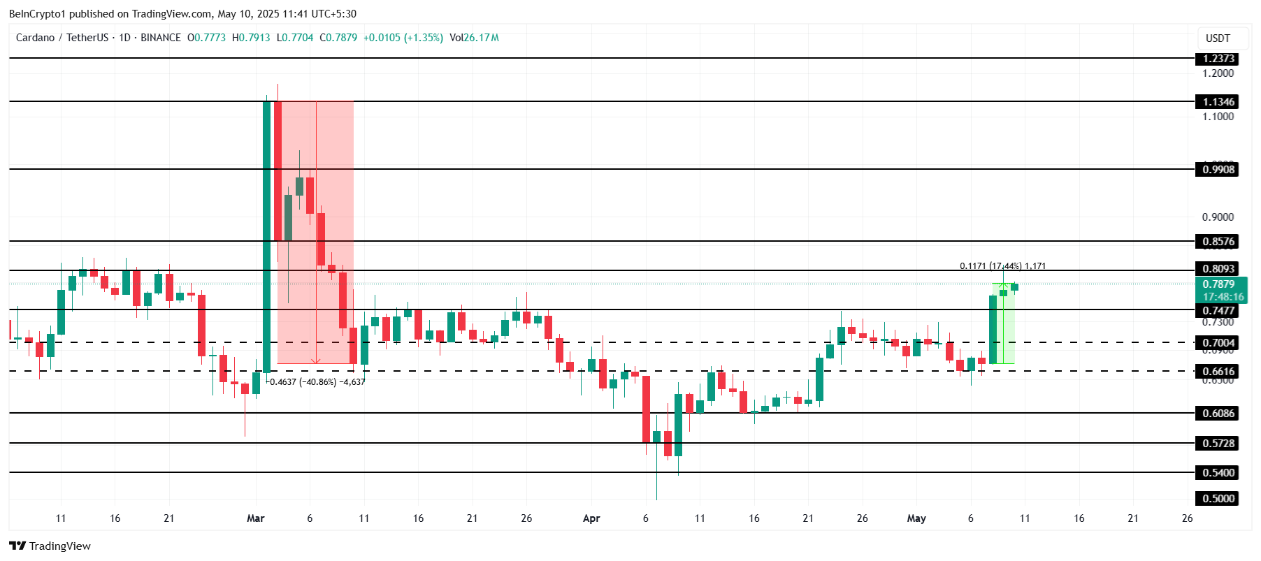 Cardano वर्तमान में $0.78 पर ट्रेड कर रहा है, जो पिछले तीन दिनों में 17% की वृद्धि है, इसे $0.80 के रेजिस्टेंस के करीब ला रहा है। यह हालिया रैली Cardano की कीमत को मार्च की शुरुआत में हुए 40% नुकसान से उबरने का एक और मौका देती है।