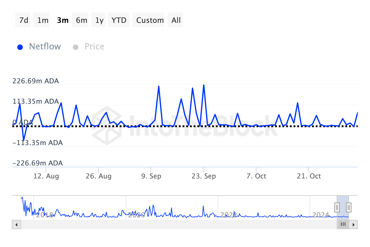 इसके अलावा, ADA के व्हेल या बड़े निवेशकों ने पिछले कुछ महीनों में अपनी होल्डिंग्स को बढ़ते हुए बेचा है, जैसा कि अल्टकॉइन के बड़े होल्डर्स के नेटफ्लो में महत्वपूर्ण गिरावट से साबित होता है। IntoTheBlock के डेटा के अनुसार, यह पिछले 90 दिनों में 188% से अधिक गिर गया है।