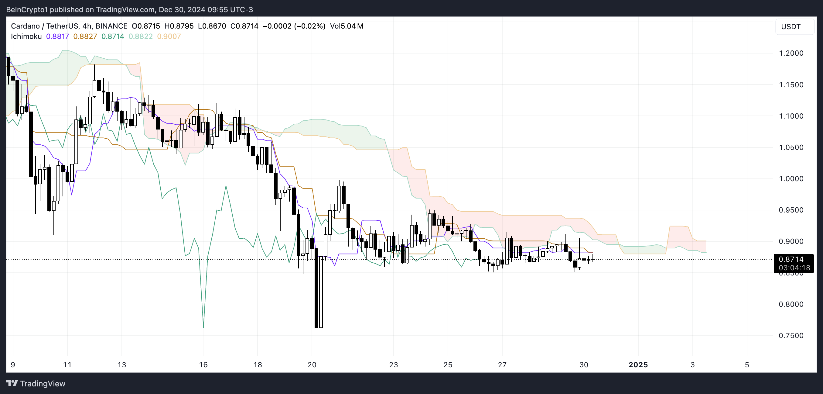 Cardano Ichimoku Cloud चार्ट मुख्य रूप से एक मंदी की सेटअप प्रदर्शित करता है। कीमत लाल क्लाउड के नीचे स्थित है, जो चल रही डाउनवर्ड गति को दर्शाती है।