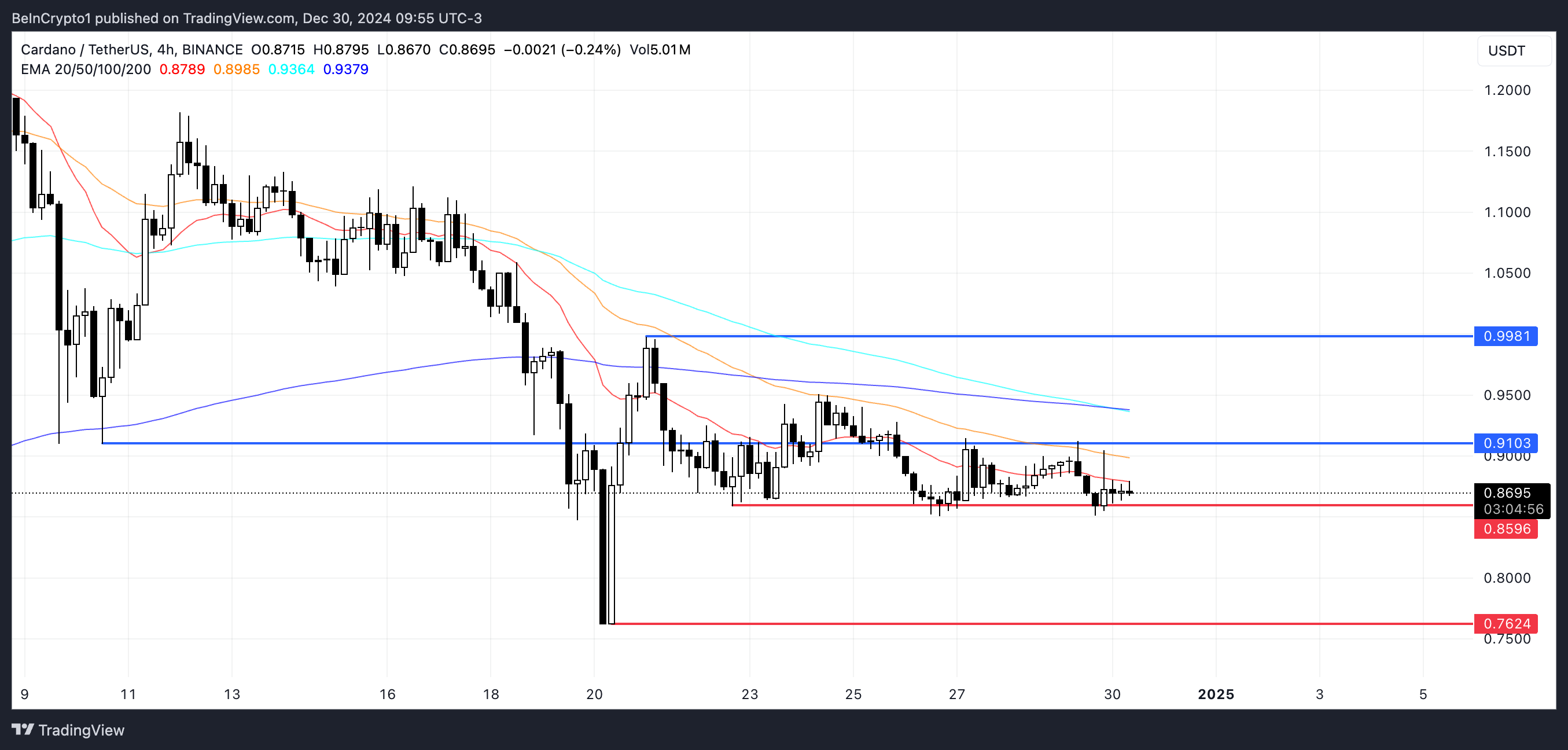 Cardano प्राइस वर्तमान में $0.859 पर एक करीबी सपोर्ट स्तर है, जो एसेट की अगली दिशा निर्धारित करने में महत्वपूर्ण भूमिका निभाता है। यदि यह सपोर्ट नहीं टिकता है, तो यह और अधिक डाउनसाइड मोमेंटम की ओर ले जा सकता है, अगला लक्ष्य $0.76 पर है।