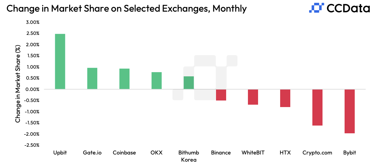 हालांकि, फर्म ने स्पष्ट किया कि यह वृद्धि केवल अमेरिका-आधारित कंपनियों तक सीमित नहीं थी। वास्तव में, CCData ने दावा किया कि सबसे तेजी से बढ़ने वाला एक्सचेंज दक्षिण कोरिया में Upbit था, जिसने मासिक स्पॉट ट्रेडिंग में 358% की वृद्धि देखी। आश्चर्यजनक रूप से, ये लाभ दक्षिण कोरियाई नियामकों द्वारा Upbit पर 600,000 KYC उल्लंघनों का आरोप लगाने के बावजूद हुए।