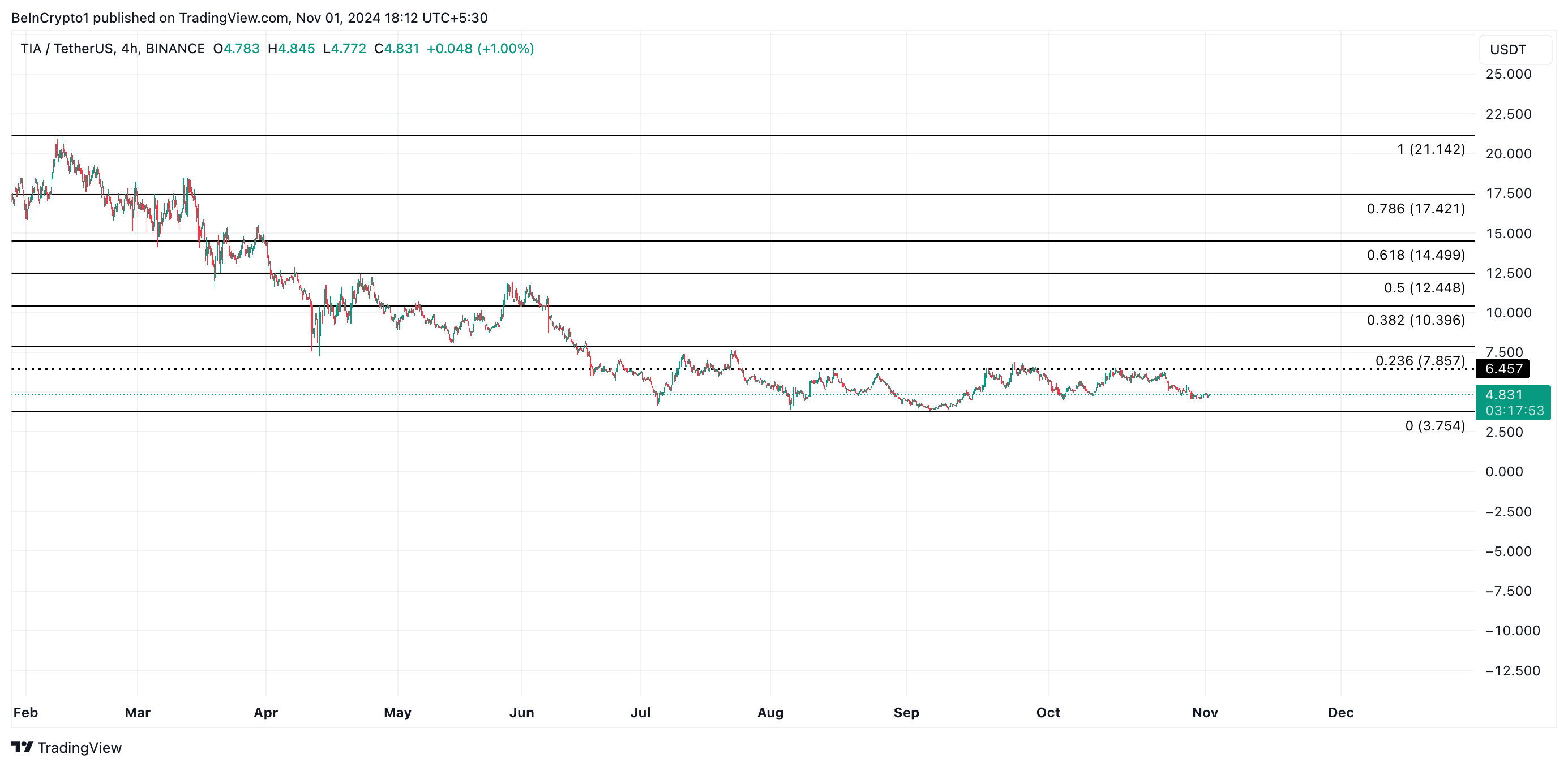 लेखन के समय, TIA का व्यापार $4.83 पर हो रहा है. निरंतर खरीद दबाव इसके ऊपरी प्रवृत्ति को बनाए रख सकता है, जिससे कीमत $6.45 के प्रतिरोध की ओर बढ़ सकती है। इस स्तर पर सफल ब्रेकआउट TIA को चार महीने की उच्चतम कीमत $7.85 तक पहुँचने का मार्ग प्रशस्त कर सकता है।