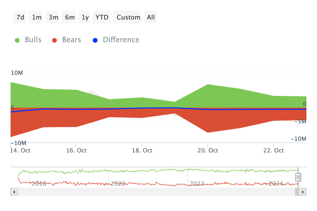 IntoTheBlock के अनुसार, Chainlink Bulls और Bears इंडिकेटर बेयर्स को प्राथमिकता देता है। इस संदर्भ में, बेयर्स वे पते हैं जो कुल ट्रेडिंग वॉल्यूम का कम से कम 1% बेचते हैं। दूसरी ओर, बुल्स वही आपूर्ति बेचते हैं।