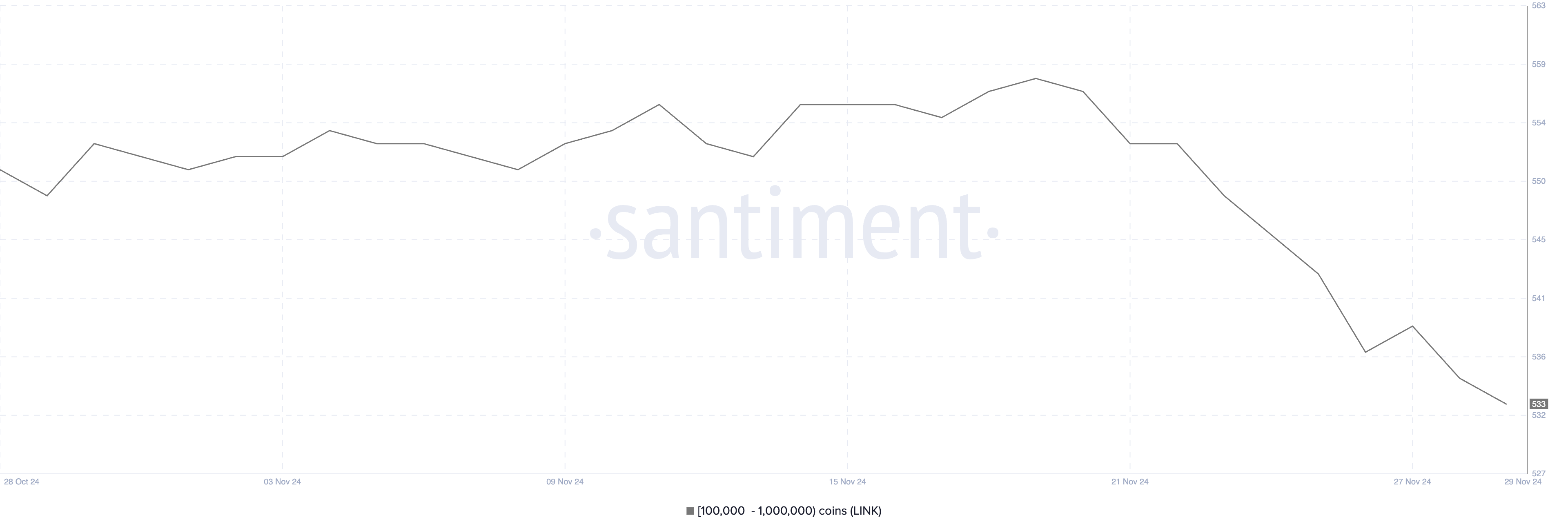100,000 से 1,000,000 LINK रखने वाले वॉलेट की संख्या 19 नवंबर को वार्षिक उच्च 558 से घटकर वर्तमान में 533 हो गई है, जो यह सुझाव देती है कि बड़े निवेशक मुनाफा ले रहे हैं या अपनी होल्डिंग्स का पुनर्वितरण कर रहे हैं।