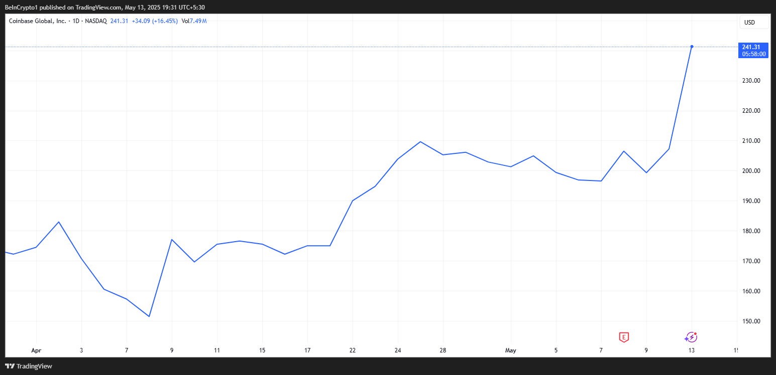 COIN ने न्यूयॉर्क स्टॉक एक्सचेंज (NYSE) पर आज, 13 मई को सुबह 9:30 बजे ET पर शुरुआत की, S&P 500 में शामिल होने के बाद। डेब्यू के बाद, COIN की कीमत 16% से अधिक बढ़ गई है और इस लेखन के समय $241.23 पर ट्रेड कर रही है।