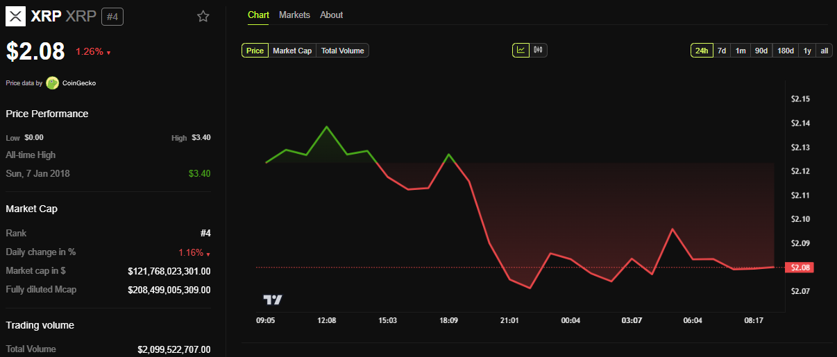 फिर भी, XRP के आसपास का बाजार भाव मिश्रित बना हुआ है। रेग्युलेटरी उपलब्धि के बावजूद, पिछले 24 घंटों में XRP की स्पॉट कीमत 1.26% गिर गई है, जो व्यापक बाजार कंसोलिडेशन और निवेशक सतर्कता को दर्शाती है।