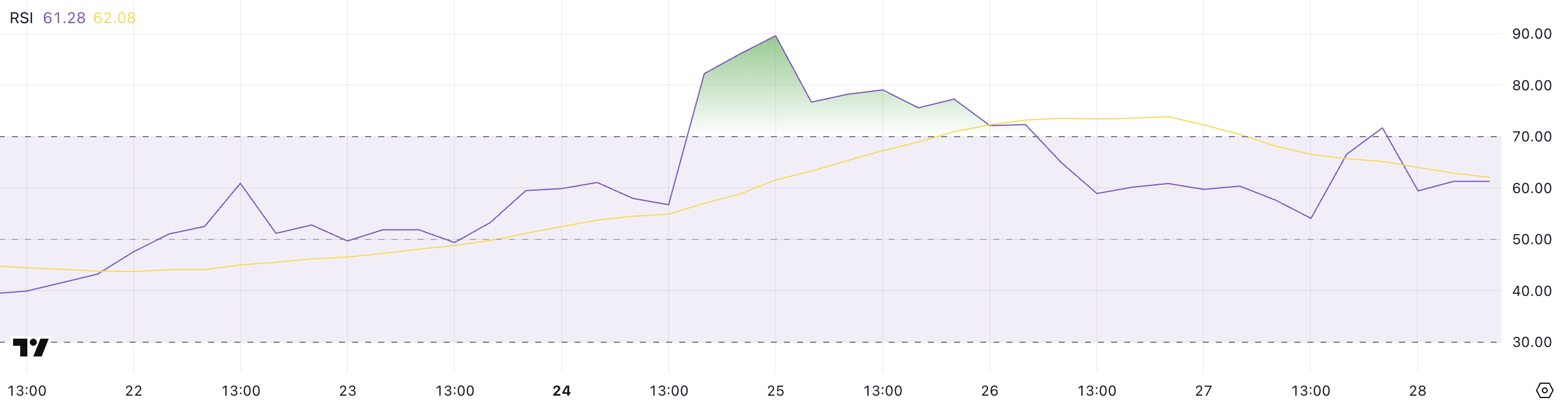 RSI (Relative Strength Index) एक मोमेंटम इंडिकेटर है जिसका उपयोग यह आकलन करने के लिए किया जाता है कि कोई एसेट ओवरबॉट या ओवरसोल्ड है या नहीं। यह 0 से 100 तक होता है, जिसमें 70 से ऊपर के स्तर आमतौर पर ओवरबॉट कंडीशंस का सुझाव देते हैं, और 30 से नीचे के स्तर ओवरसोल्ड क्षेत्र का संकेत देते हैं।