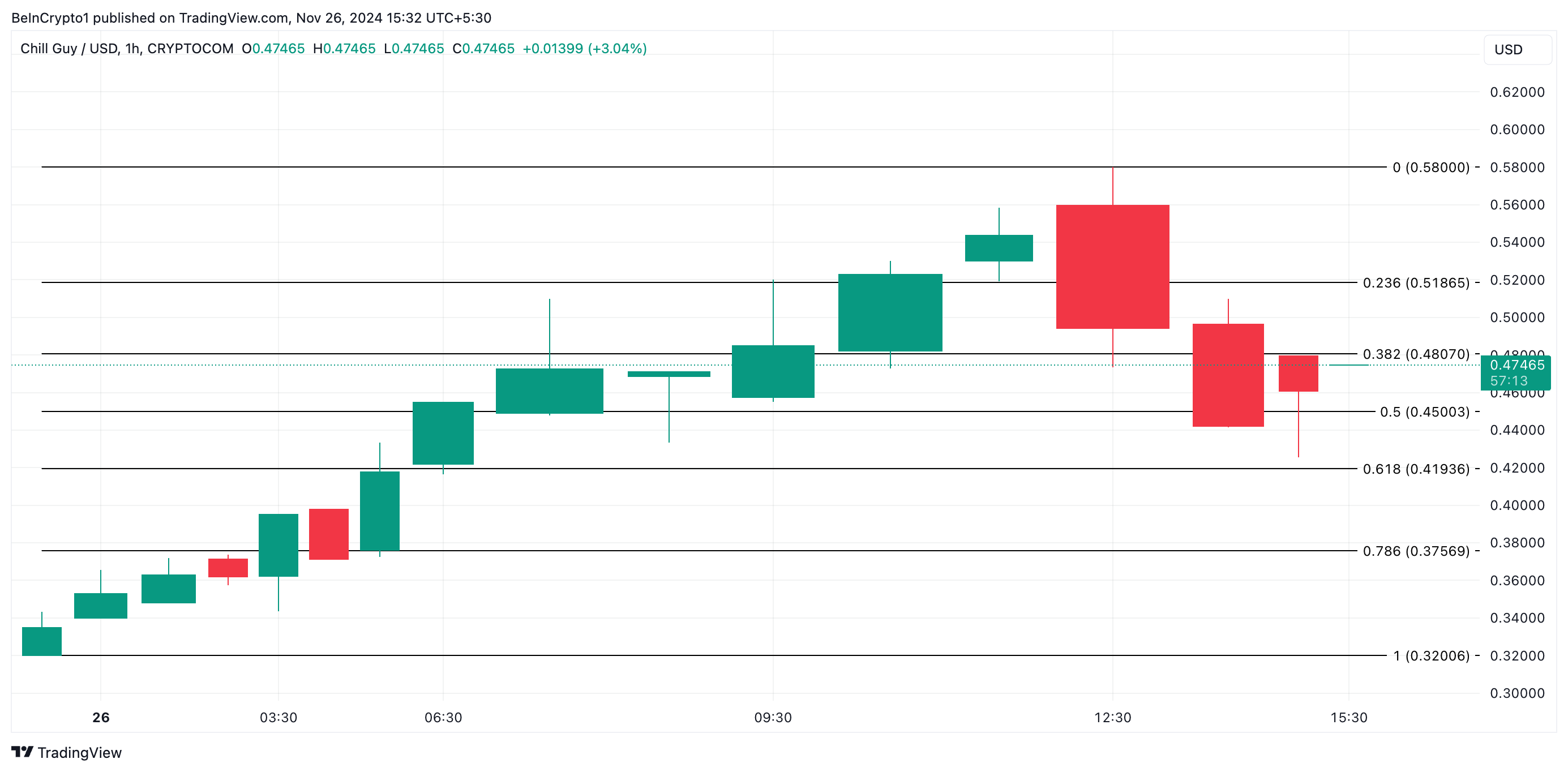 एक लोकप्रिय इंटरनेट कैरेक्टर पर आधारित, मीम कॉइन जस्ट ए चिल गाय (CHILLGUY) ने 15 नवंबर को लॉन्च होने के बाद से अपनी वैल्यू में भारी वृद्धि देखी है। ऑल्टकॉइन ने मंगलवार की शुरुआती एशियाई सत्र के दौरान $0.58 के नए ऑल-टाइम हाई तक पहुंचा। हालांकि, यह वर्तमान में $0.47 पर ट्रेड कर रहा है, जो कि प्राइस पीक से 18% की गिरावट है।