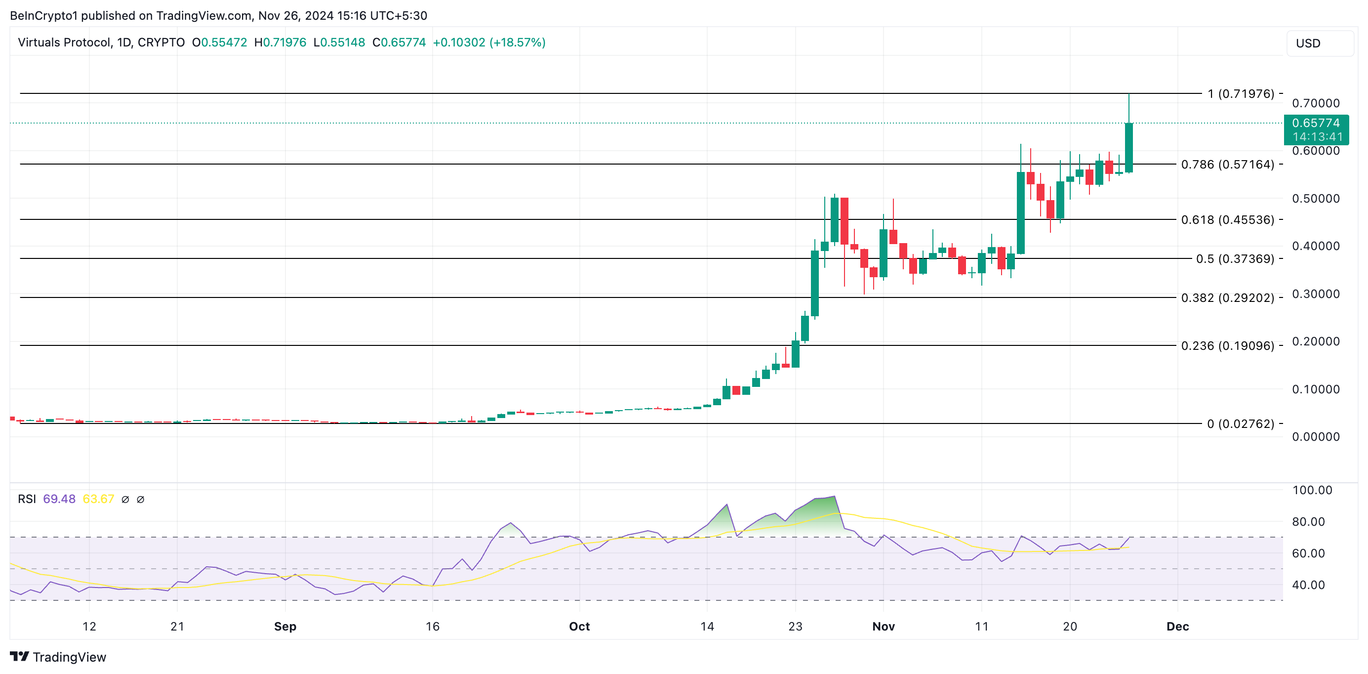 VIRTUAL की प्राइस वृद्धि ऑल्टकॉइन की वास्तविक मांग से समर्थित है, जो इसके बढ़ते राइजिंग स्ट्रेंथ इंडेक्स (RSI) में परिलक्षित होती है। प्रेस समय में, यह 69.48 पर है।