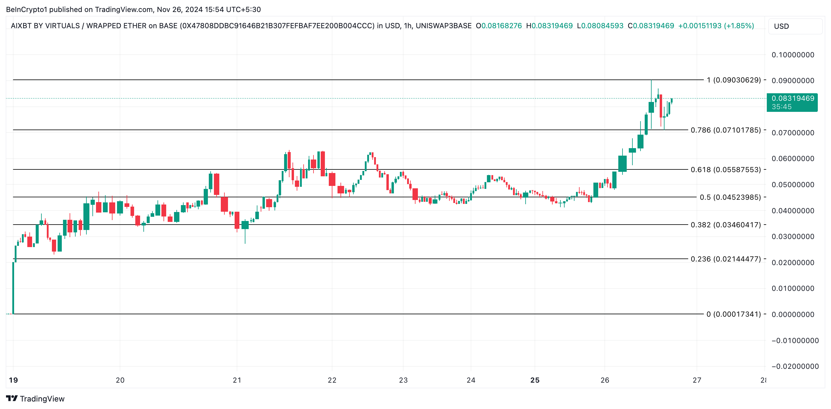 AIXBT वर्तमान में $0.08 पर ट्रेड कर रहा है। इसने 75% इंट्रा-डे वृद्धि दर्ज की है और आज $0.09 का सर्वकालिक उच्च स्तर छू लिया है। पिछले 24 घंटों में, इसका ट्रेडिंग वॉल्यूम कुल $6.05 मिलियन हो गया है, जो 487% की वृद्धि है।