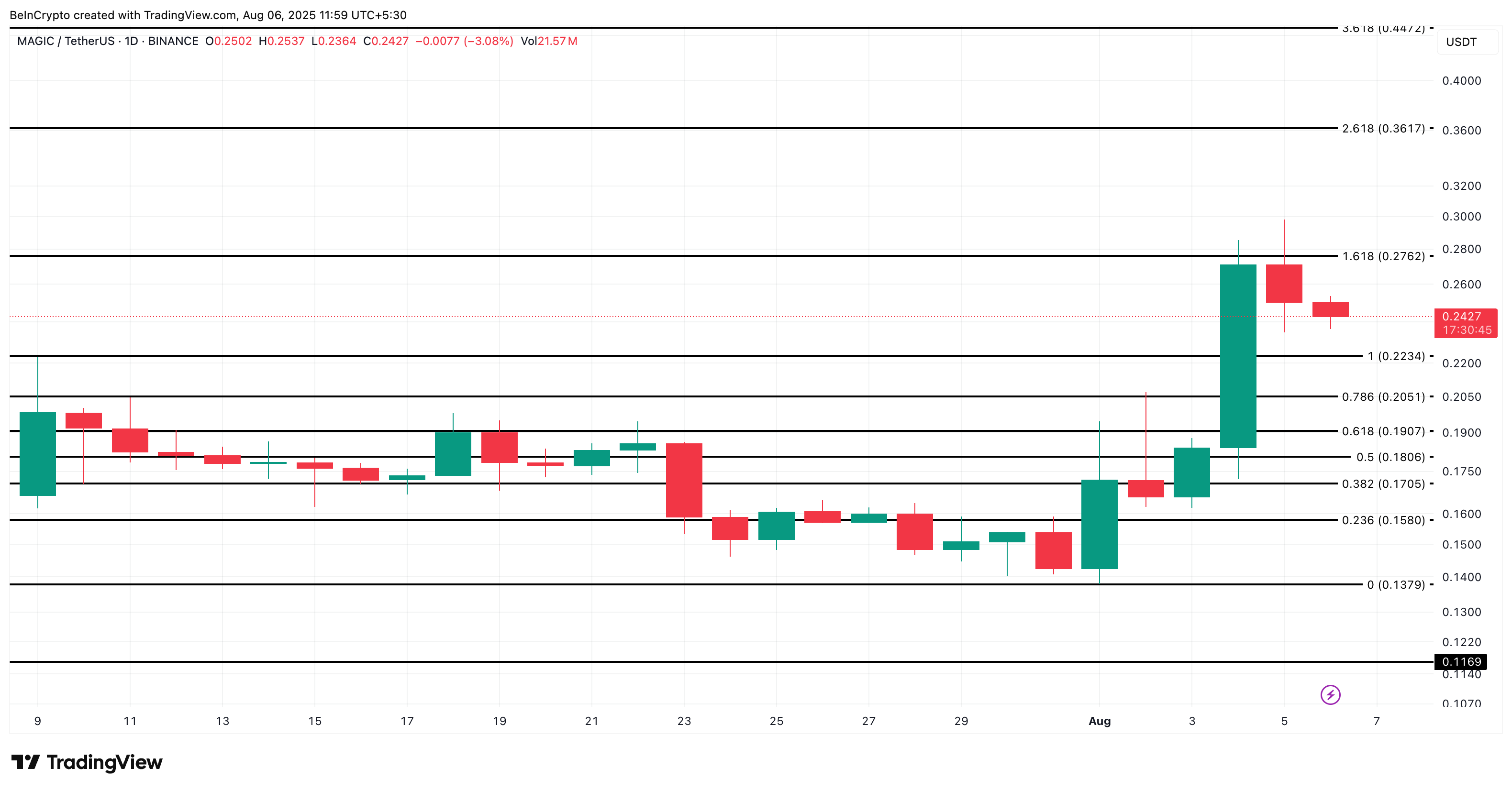 तकनीकी रूप से, MAGIC ने अभी $0.27 पर 1.618 Fibonacci लेवल को क्लियर किया है लेकिन तुरंत रेजिस्टेंस का सामना किया। इस जोन के ऊपर एक साफ मूव $0.36 या उससे अधिक की रन खोल सकता है, Fibonacci रिट्रेसमेंट लेवल्स के अनुसार। नीचे की ओर, $0.22 (Fib स्टार्ट या अंतिम स्विंग हाई) एक मजबूत शॉर्ट-टर्म सपोर्ट के रूप में कार्य करता है, और जब तक $0.17 होल्ड करता है, संरचना बुलिश बनी रहती है।