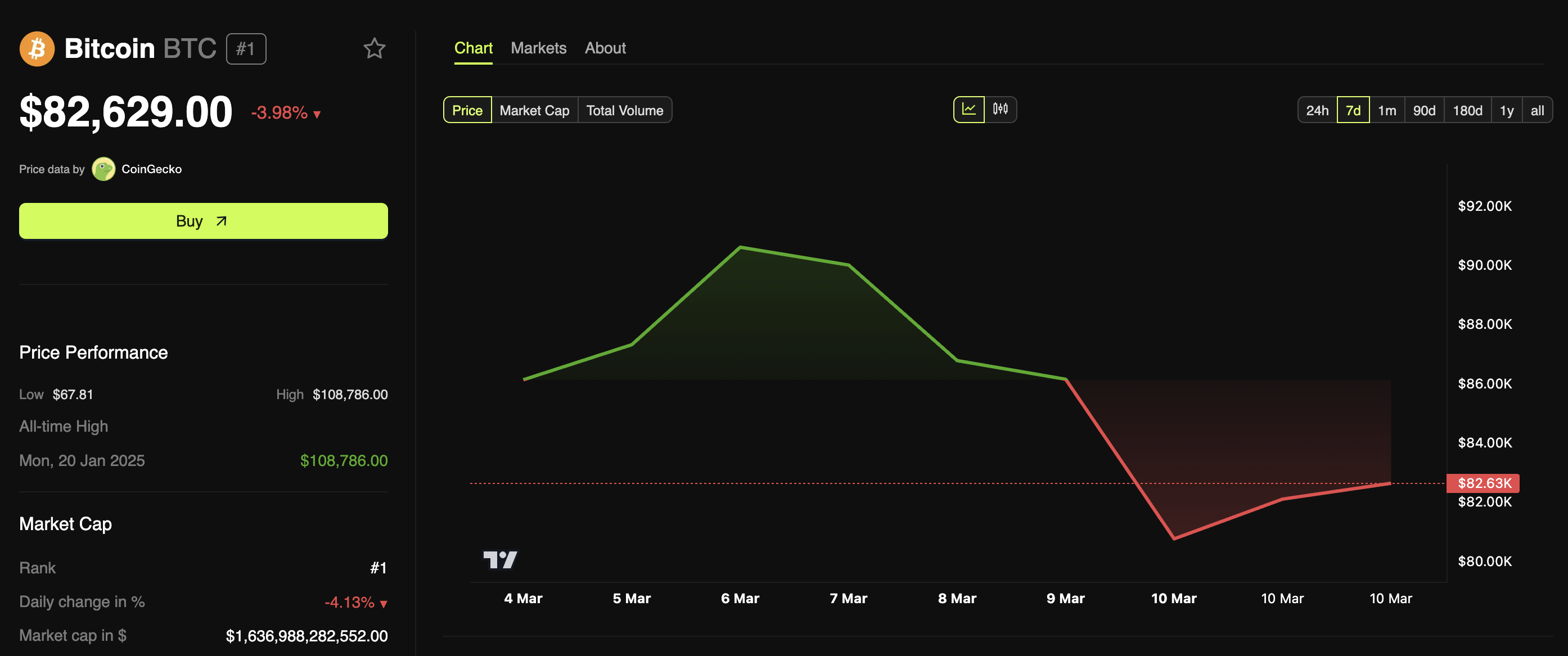 फिलहाल, BTC $80,000 से ऊपर बना हुआ है। लेखन के समय, यह $82,629 पर ट्रेड कर रहा था, पिछले 24 घंटों में 3.9% नीचे।