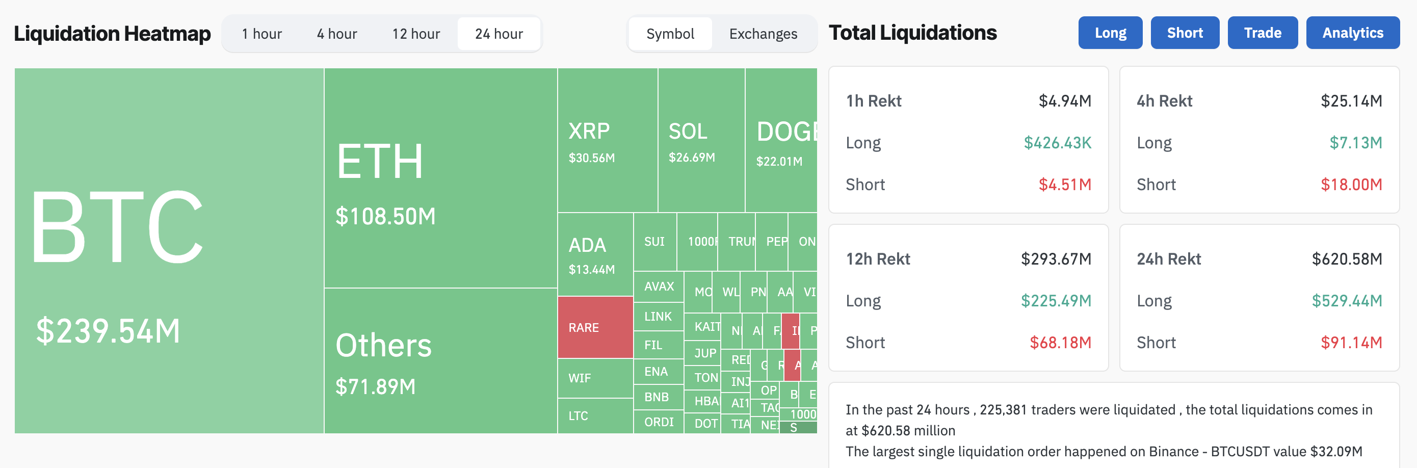लॉन्ग पोजीशन्स को सबसे ज्यादा नुकसान हुआ, जिसमें $529.4 मिलियन का नुकसान हुआ। वहीं, शॉर्ट पोजीशन्स में $91.1 मिलियन की लिक्विडेशन देखी गई।