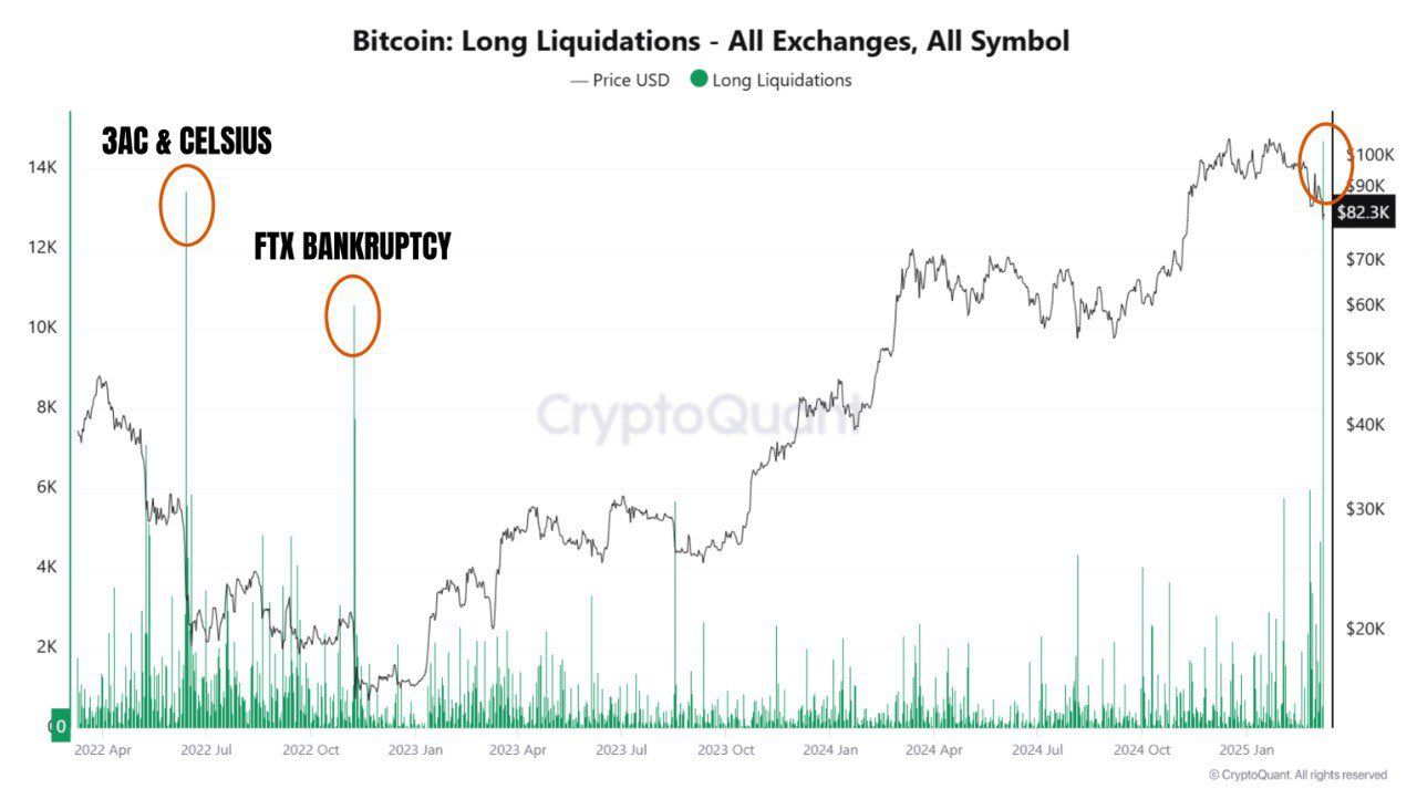 CryptoQuant के डेटा से पता चलता है कि बिटकॉइन की लॉन्ग लिक्विडेशन्स कल 14,714 तक बढ़ गईं। तुलना के लिए, Celsius क्रैश के दौरान 13,453 BTC, FTX के पतन के दौरान 1,807 BTC, और Three Arrows Capital (3AC) के संकट में 1,311 BTC लिक्विडेट हुए थे।