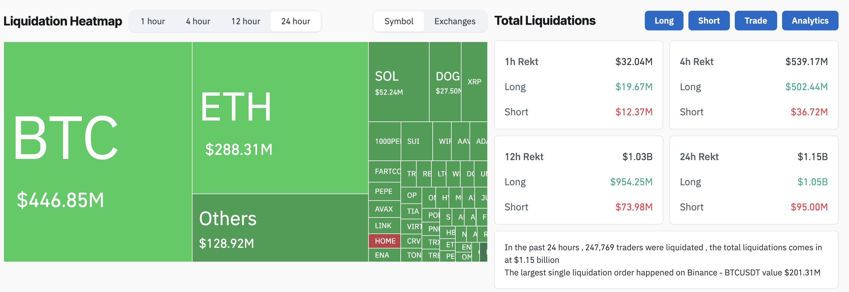 पिछले 24 घंटों में, कुल लिक्विडेशन $1.15 बिलियन तक पहुंच गई। इसके अलावा, कुल मार्केट 6.6% नीचे है।