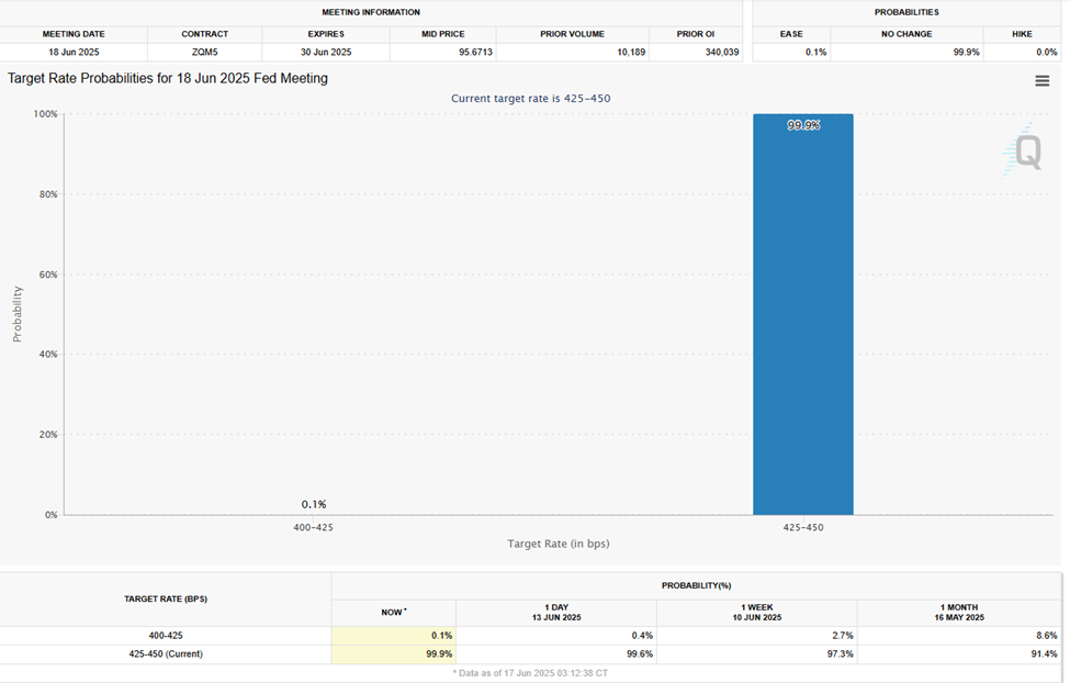 जबकि फेड से व्यापक रूप से ब्याज दर स्थिर रखने की उम्मीद है, Polymarket के अनुसार जून में 98% और जुलाई में 84% संभावना है कि कोई बदलाव नहीं होगा, कई क्रिप्टो विश्लेषक इस पर अधिक ध्यान केंद्रित कर रहे हैं कि क्या नहीं कहा जा रहा है।