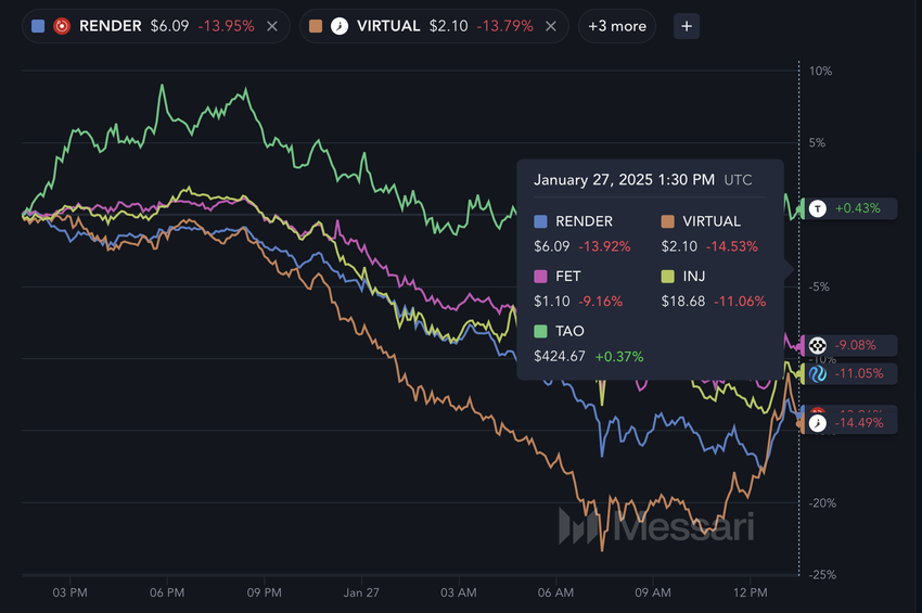 AI क्रिप्टो पर इसका गहरा असर पड़ा है, जिसमें AI से संबंधित क्रिप्टो का मार्केट कैप पिछले दिन में 10.2% गिरकर $37.4 बिलियन हो गया है। अधिकांश प्रमुख AI कॉइन्स को भी नुकसान हुआ है।