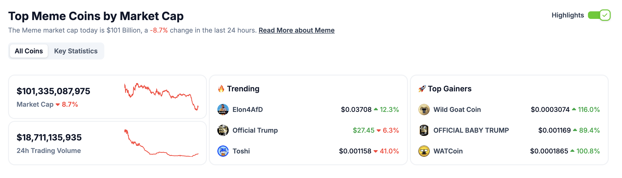 मीम कॉइन्स का मार्केट कैप पिछले 24 घंटों में 8.7% गिरकर $101 बिलियन हो गया है, जो $100 बिलियन के निशान के करीब है। सभी शीर्ष 10 मीम कॉइन्स नीचे हैं, जिसमें FARTCOIN 20%, PENGU 15%, और PEPE 13% गिर गए हैं।