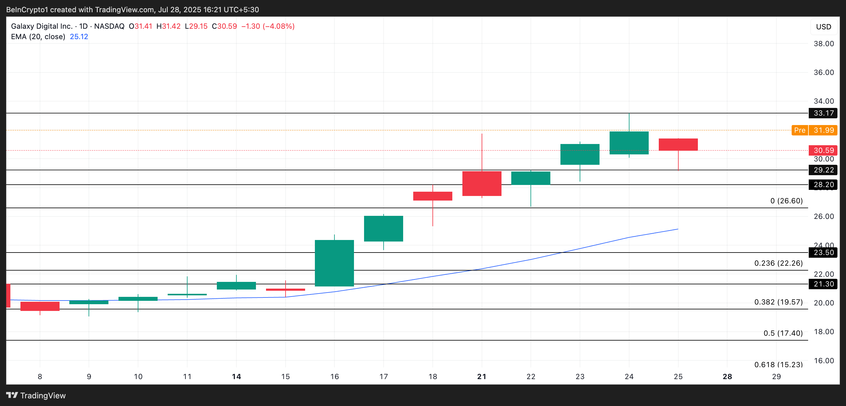 25 जुलाई के ट्रेडिंग सत्र के दौरान, GLXY शेयर $30.59 के निचले स्तर पर बंद हुए क्योंकि भावना खराब हो गई। हालांकि, स्टॉक ने तब से रिकवरी के संकेत दिखाए हैं, जो आज प्री-मार्केट गतिविधि में $31.99 पर ट्रेड कर रहा है। यदि बुलिश मोमेंटम बाजार खुलने पर लौटता है, तो GLXY $33.17 के स्तर की ओर बढ़ सकता है, जो शॉर्ट-टर्म में एक संभावित रेजिस्टेंस स्तर है।