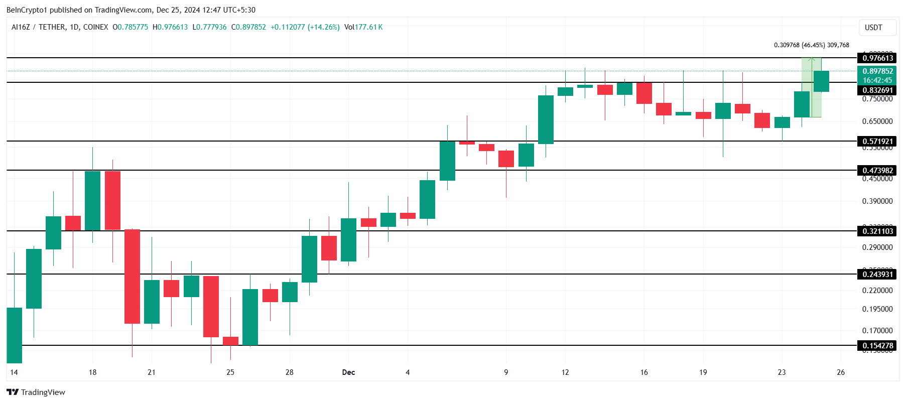 AI16Z ने पिछले 24 घंटों में 46% की वृद्धि की, $0.976 के इंट्रा-डे ऑल-टाइम हाई तक पहुंचने के बाद $0.897 पर स्थिर हो गया। यह प्रभावशाली उछाल निवेशकों की नई रुचि को दर्शाता है और altcoin के लिए एक महत्वपूर्ण सफलता को चिह्नित करता है। AI16Z की प्राइस एक्शन शॉर्ट-टर्म में निरंतर लाभ की संभावना का सुझाव देती है।