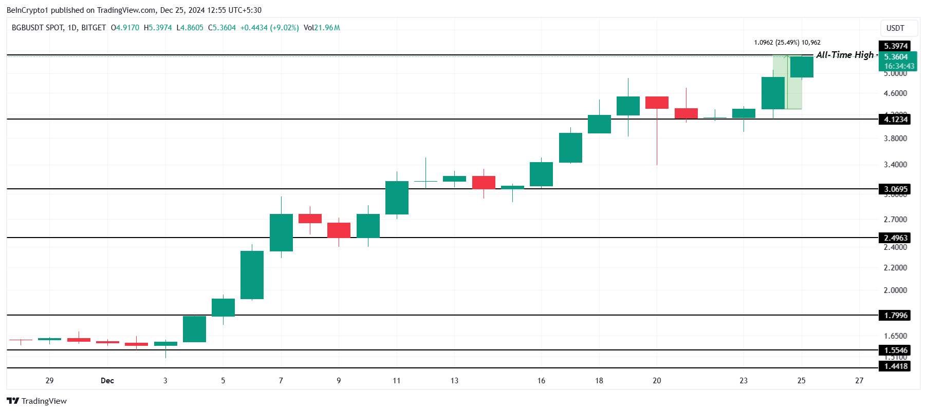 BGB में 25% की वृद्धि पिछले 24 घंटों में हुई, जिससे यह $5.39 के ATH पर पहुंच गया। इस नाटकीय वृद्धि ने altcoin को एक प्रमुख प्रदर्शनकर्ता बना दिया है, जिससे निवेशकों का महत्वपूर्ण ध्यान आकर्षित हुआ है। इसका बुलिश मोमेंटम BGB को वर्तमान मार्केट वातावरण में निरंतर लाभ के लिए एक शीर्ष दावेदार के रूप में स्थापित करता है।