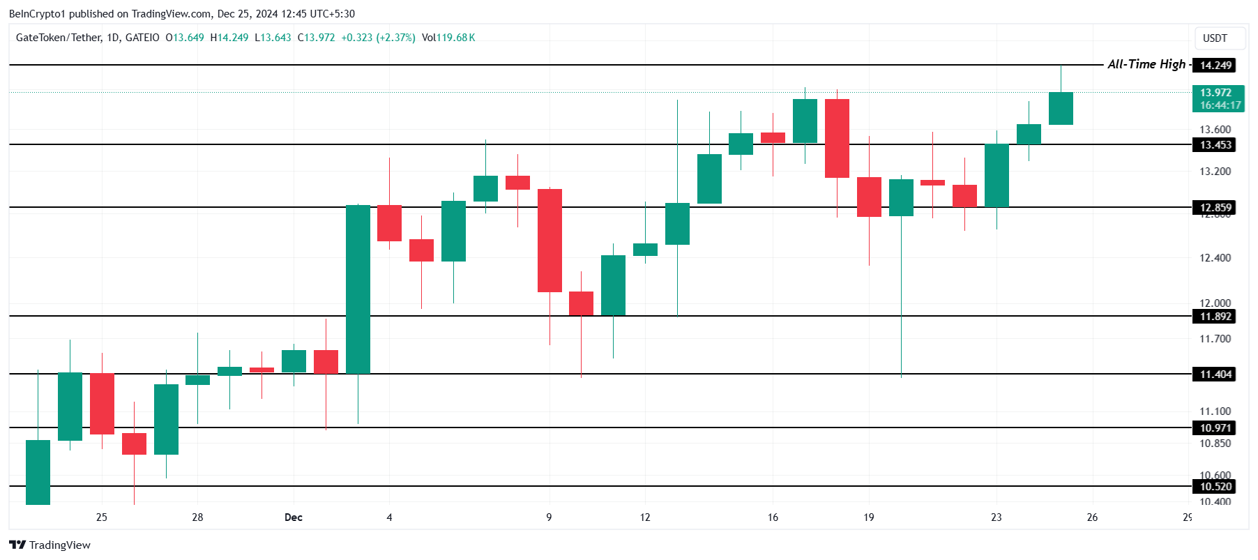 एक और क्रिप्टो टोकन जिसने आज एक नया ऑल-टाइम हाई प्राप्त किया वह GT था, जो $14.24 पर पहुंच गया, $13.45 पर मजबूत सपोर्ट के कारण। इस प्राइस वृद्धि ने बुलिश मार्केट सेंटीमेंट को दर्शाया है, जिसमें व्यापक मार्केट स्थितियों ने अपवर्ड मोमेंटम में योगदान दिया है।