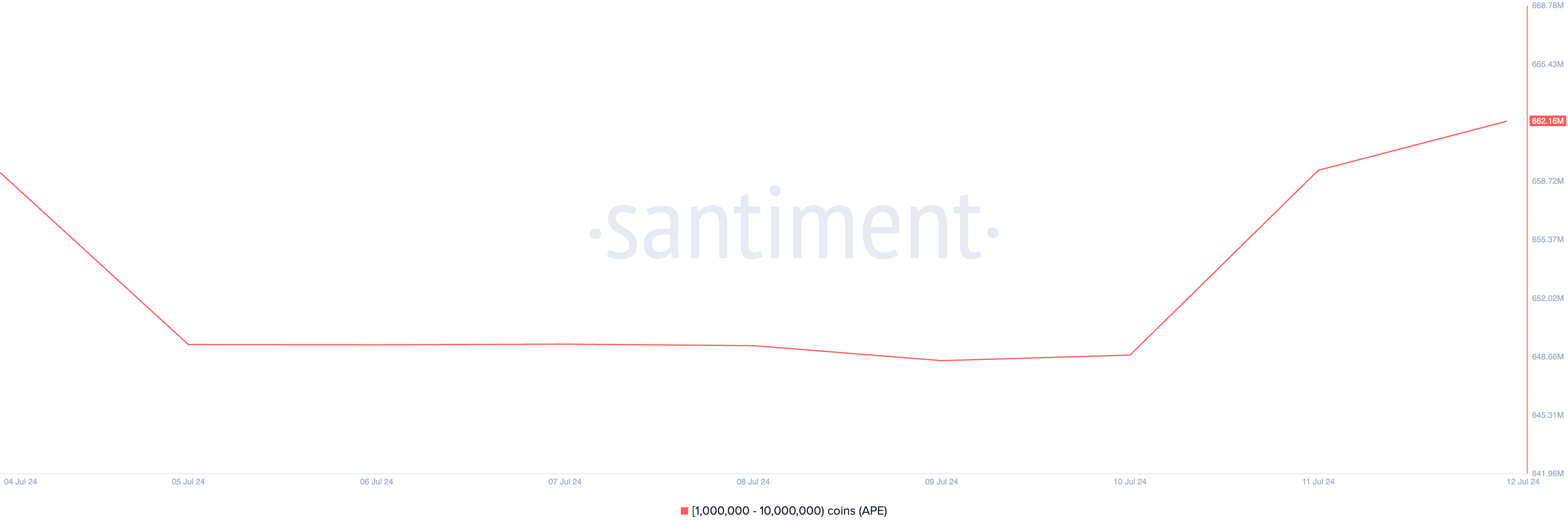 समीक्षा अवधि के दौरान, व्हेल एड्रेसेस जिनके पास 1 मिलियन से 10 मिलियन टोकन्स हैं, उन्होंने कुल मिलाकर 2.93 मिलियन APE का अधिग्रहण किया है। इस लेखन के समय, APE निवेशकों का यह समूह 752.65 मिलियन की सर्क्युलेटिंग सप्लाई में से 662.16 मिलियन टोकन्स रखता है।