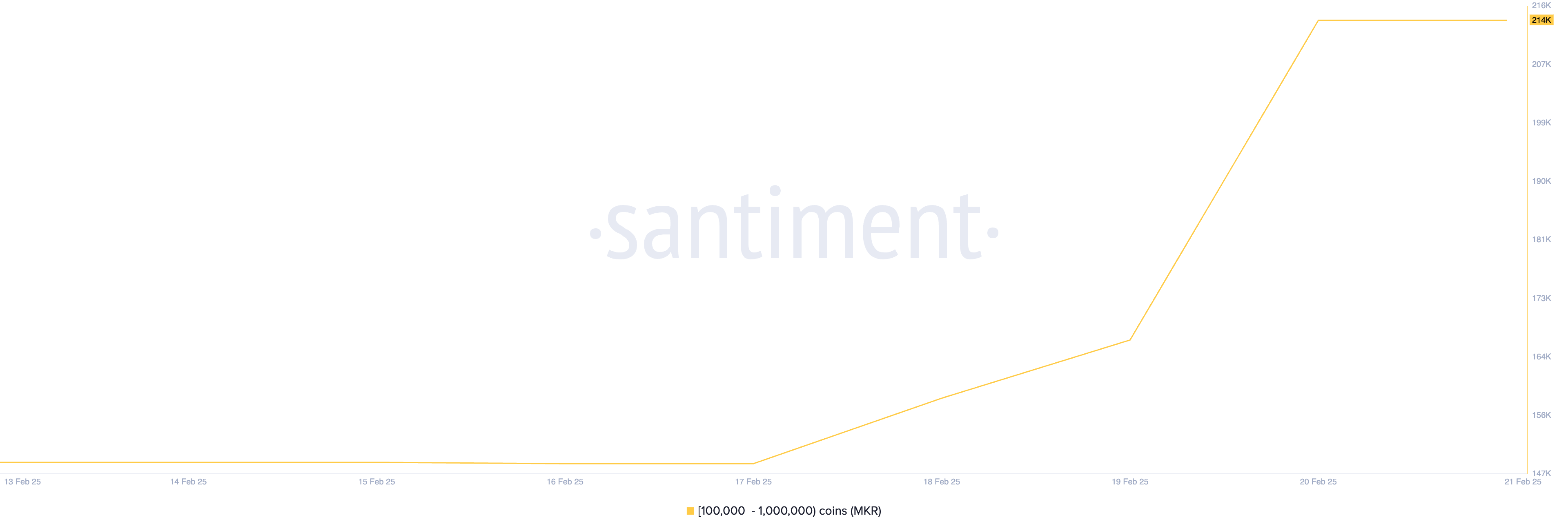 Santiment के अनुसार, इस निवेशकों के समूह ने पिछले सात दिनों में 65,000 MKR टोकन जमा किए हैं, जिनकी वर्तमान मार्केट कीमत पर $92 मिलियन से अधिक की वैल्यू है। प्रेस समय पर, वे 214,000 MKR होल्ड करते हैं, जो अप्रैल 2023 के बाद से उनकी सबसे बड़ी संख्या है।