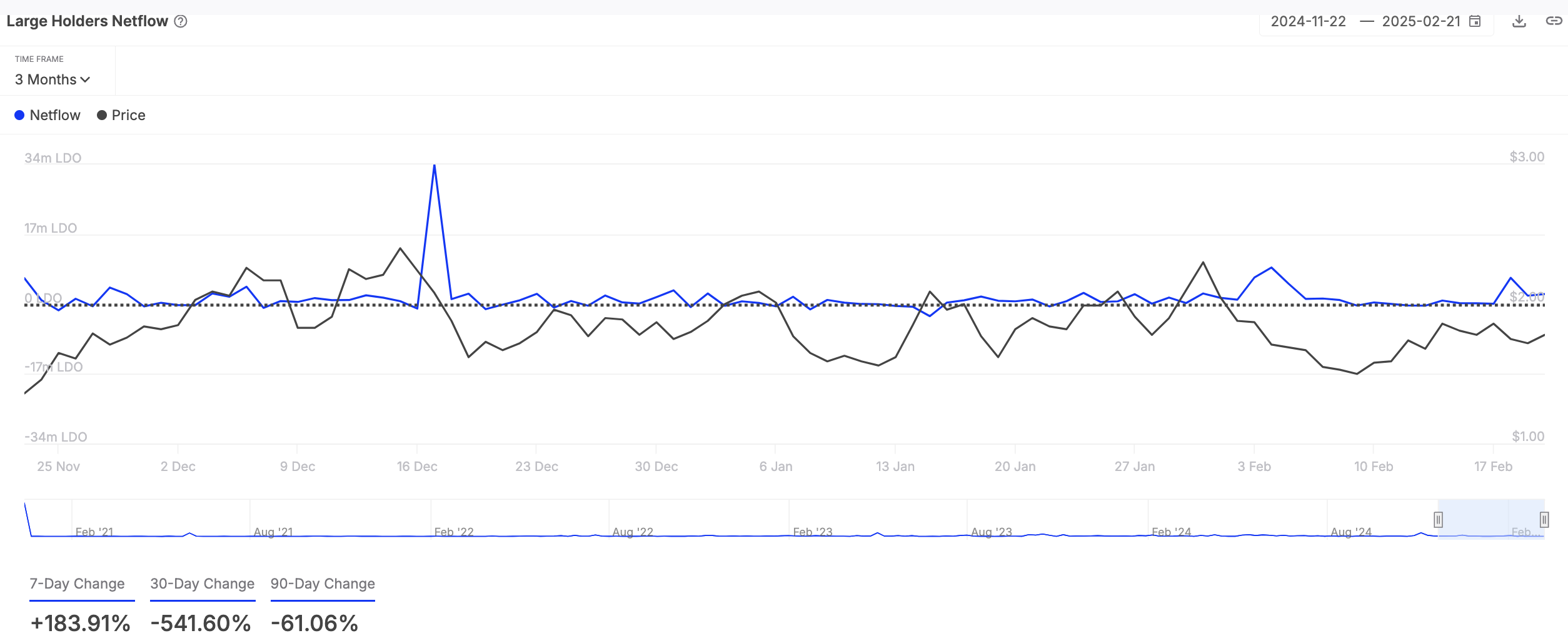 बड़े होल्डर्स वे निवेशक होते हैं जो किसी एसेट की सर्क्युलेटिंग सप्लाई का 0.1% से अधिक नियंत्रित करते हैं। उनका नेटफ्लो उस अवधि के दौरान खरीदे और बेचे गए कॉइन्स के बीच के अंतर को मापता है।