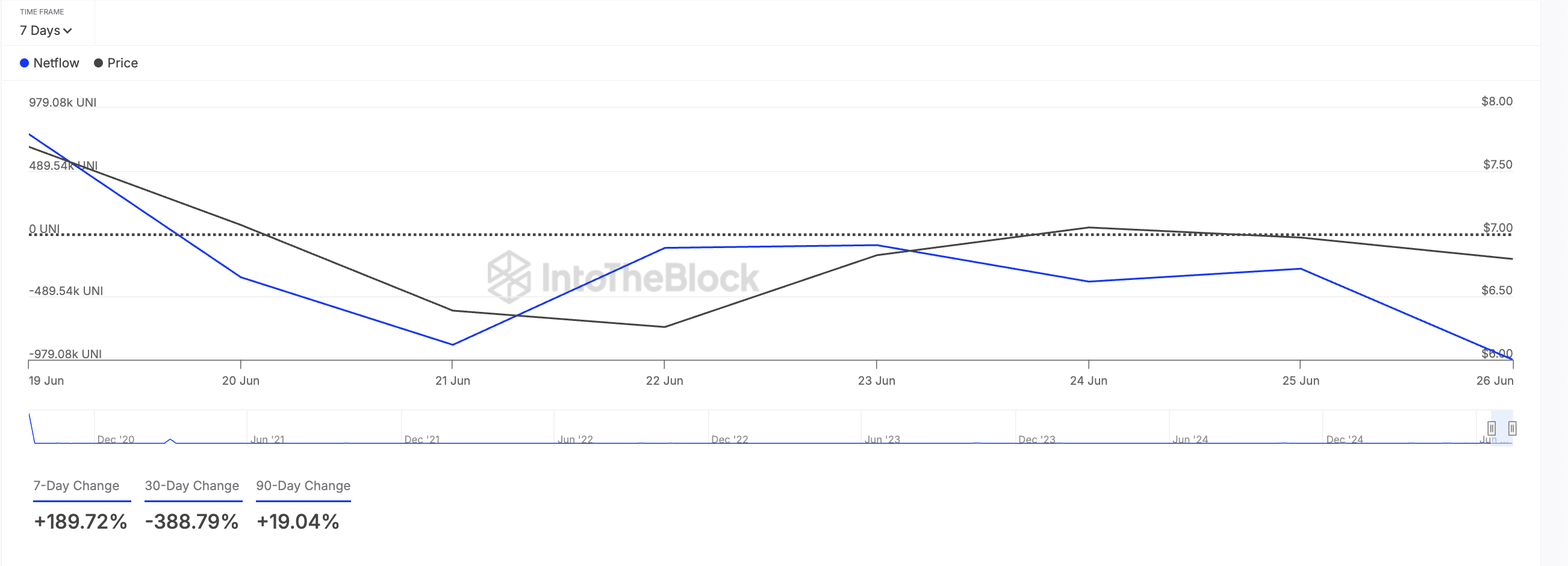 इस हफ्ते, डिसेंट्रलाइज्ड फाइनेंस (DeFi) टोकन UNI को व्हेल्स का महत्वपूर्ण ध्यान मिला है। यह इसके बड़े धारकों के नेटफ्लो से परिलक्षित होता है, जो पिछले सात दिनों में 190% बढ़ा है, IntoTheBlock के अनुसार।