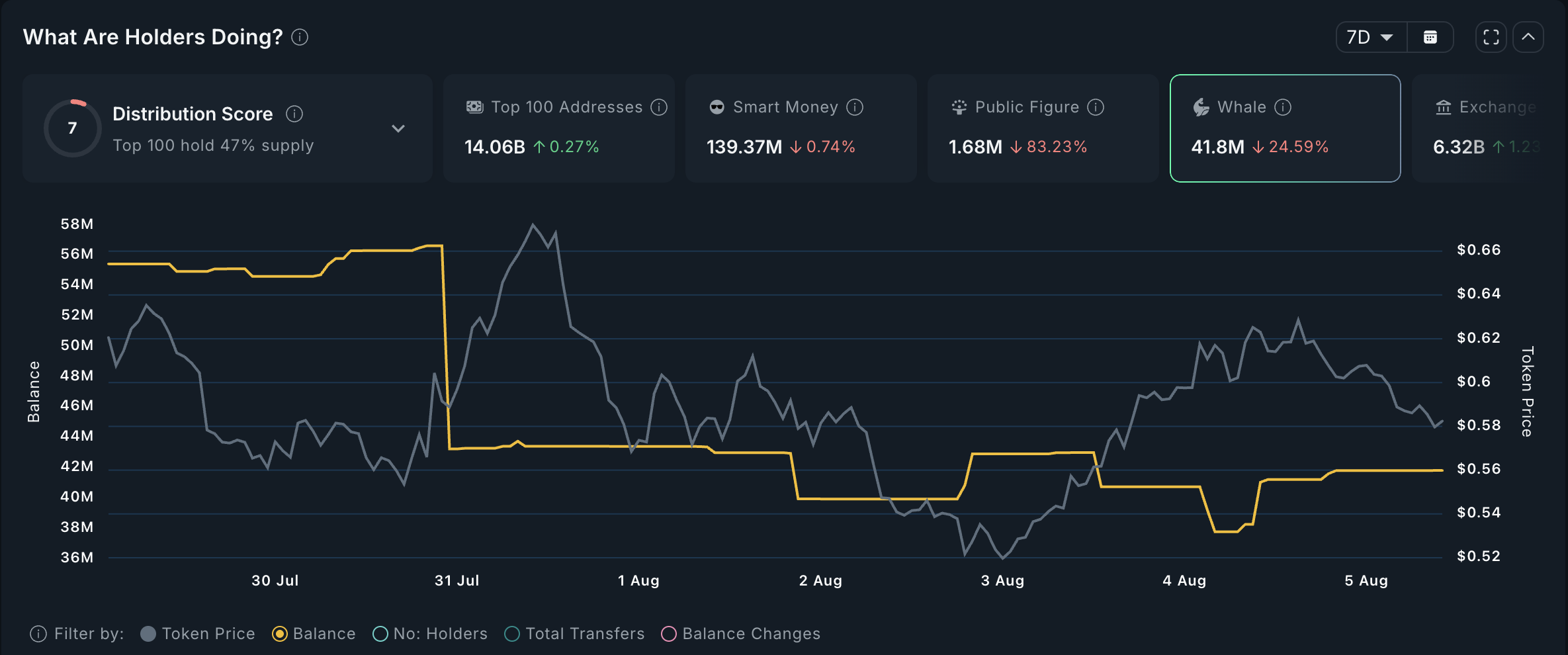 Nansen के डेटा से पता चलता है कि पिछले सप्ताह ENA के बड़े होल्डर गतिविधि में गिरावट आई है। ऑन-चेन डेटा प्रदाता के अनुसार, उन व्हेल वॉलेट्स का टोकन बैलेंस, जो $1 मिलियन से अधिक के टोकन रखते हैं, पिछले सात दिनों में 25% कम हो गया है।