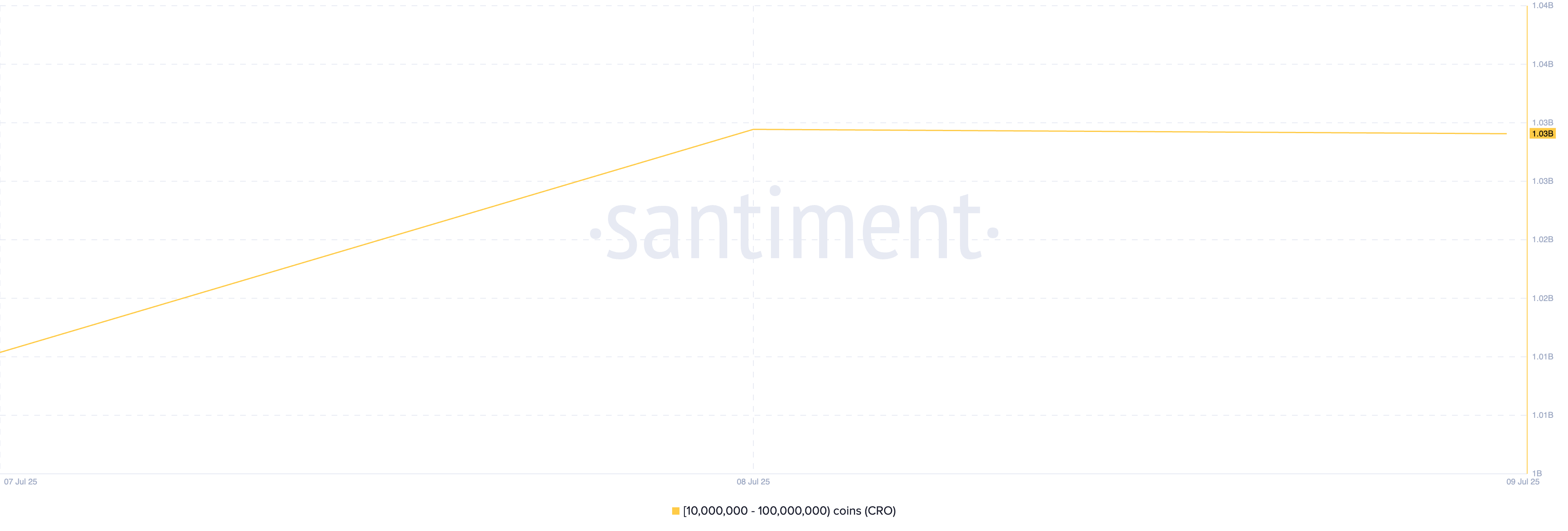 Santiment के डेटा के अनुसार, बड़े CRO धारकों—जिनके वॉलेट में 10 मिलियन से 100 मिलियन टोकन हैं—ने पिछले दो दिनों में अतिरिक्त 20 मिलियन CRO जमा किए हैं, जिससे उनकी कुल होल्डिंग्स 1.03 बिलियन कॉइन्स हो गई हैं।