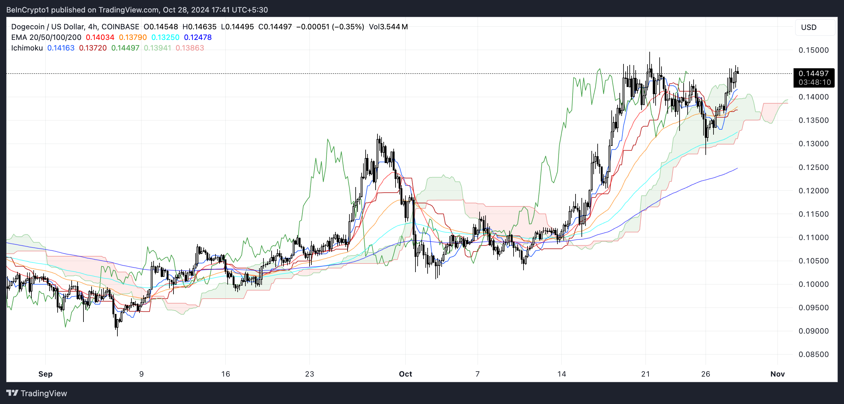 Dogecoin (DOGE) की कीमत में तेजी के संकेत दिख रहे हैं, क्योंकि हाल के तकनीकी संकेतक संभावित लाभ की ओर इशारा कर रहे हैं। Ichimoku Cloud, EMA लाइनें, और DMI सभी सकारात्मक गति का सुझाव दे रहे हैं, हालांकि ट्रेंड की ताकत अभी भी अनिश्चित है।