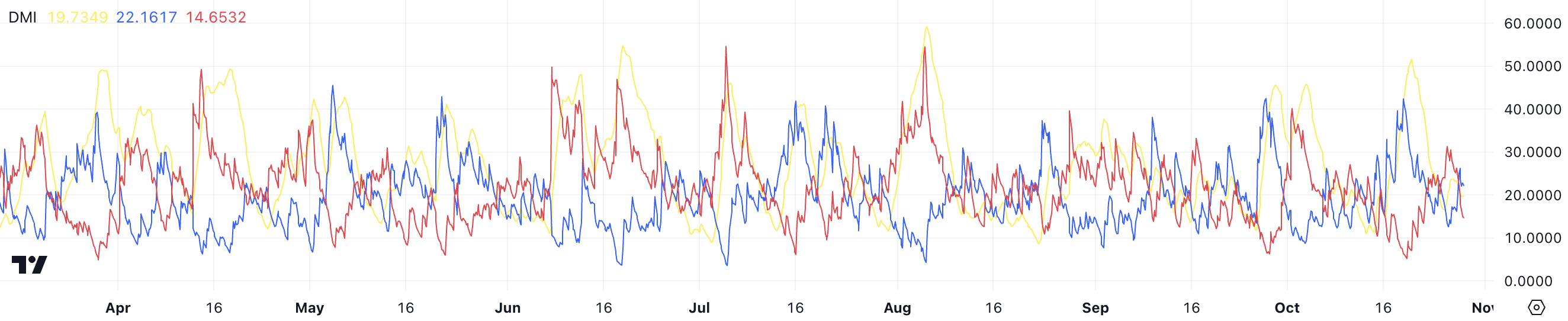 नीली रेखा (+DI) और लाल रेखा (-DI) क्रमशः खरीदने और बेचने के दबाव को दर्शाती हैं। +DI -DI से थोड़ा ऊपर है, जिसका अर्थ है कि खरीदारों का विक्रेताओं पर हल्का प्रभुत्व है। हालांकि, दोनों रेखाएँ एक-दूसरे के करीब होने के कारण, यह सुझाव देता है कि खरीदने की गति अत्यधिक मजबूत नहीं है।