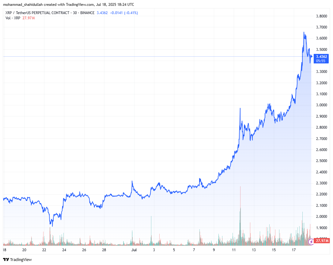 XRP की हालिया रैली एक व्यापक मार्केट अपवर्ड का हिस्सा है। टोकन ने 24 घंटों में 5% की वृद्धि की, अपने पिछले $3.40 के उच्च स्तर को तोड़कर $3.65 तक पहुंच गया।