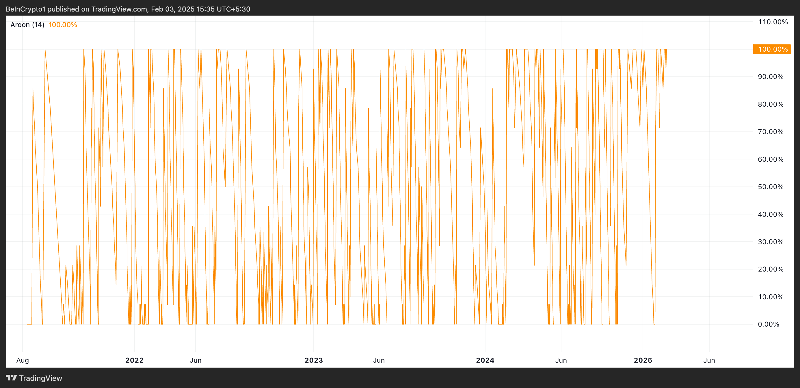 जब किसी एसेट की अरुण अप लाइन 100% पर होती है, तो यह इंगित करता है कि इसका सबसे हालिया उच्च स्तर बहुत हाल ही में पहुंचा था। यह DEXE के लिए सही है, जो वर्तमान में चार साल के उच्च स्तर पर ट्रेड कर रहा है।