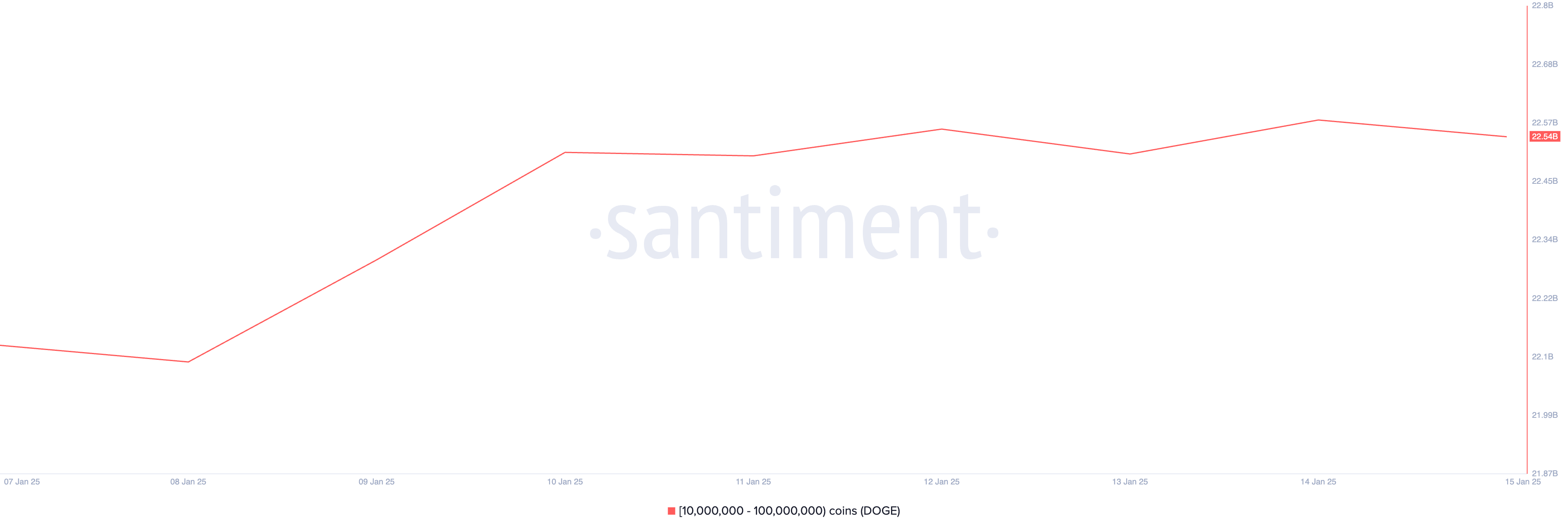 पिछले सप्ताह में, Dogecoin व्हेल्स जो 10,000,000 से 100,000,000 DOGE के बीच होल्ड करते हैं, ने 410 मिलियन DOGE जमा किए हैं, जिनकी कीमत $140 मिलियन है। वर्तमान में, यह व्हेल्स का समूह सामूहिक रूप से 22.54 बिलियन DOGE होल्ड करता है — फरवरी 2016 के बाद से उनकी सबसे उच्चतम होल्डिंग्स स्तर।